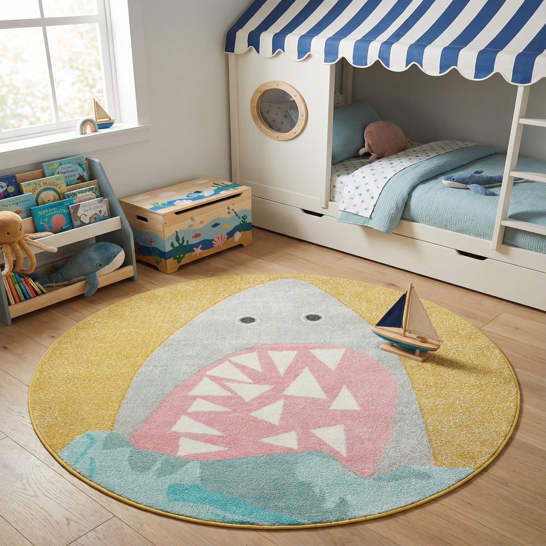 A cheerful round rug with a playful shark motif set against a warm yellow field. The shark's gray body is rendered in a soft, simplified silhouette with small black eyes and an oversized pink mouth filled with ivory triangular teeth, while a wash of light blue along the bottom suggests gentle waves. Made from 100% polypropylene, the rug has a soft hand and a low, even pile that shows color and pattern clearly while offering a comfortable surface underfoot.