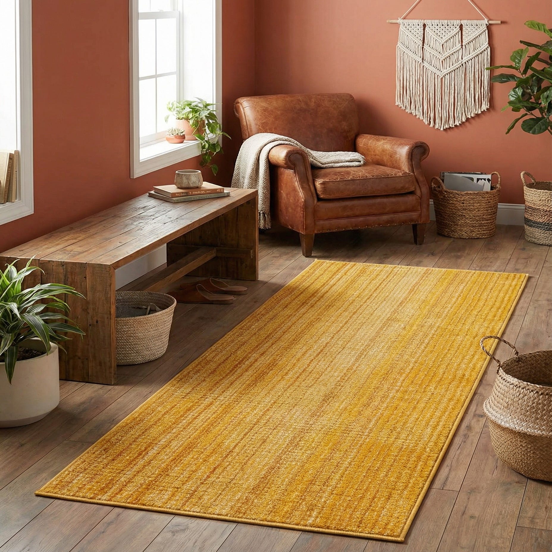 A warm yellow field threaded with narrow orange striations creates a calm, linear pattern that runs the length of the rug. The look is contemporary and uncomplicated, with the orange accents adding depth and a subtle sense of movement without competing with other room elements. Machine-made from polypropylene, the weave produces a consistent finish and a slight sheen that highlights the tonal variation.