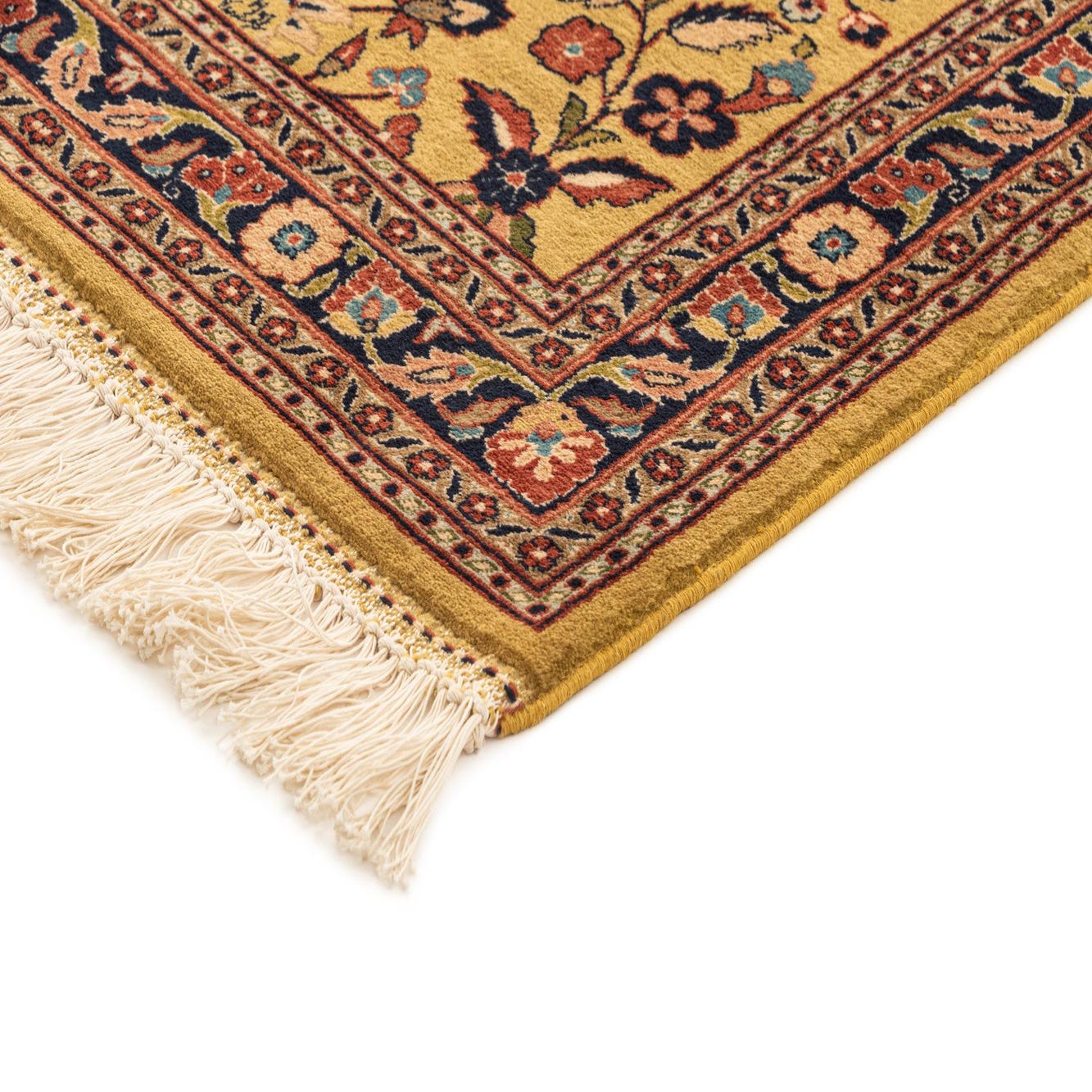 A 5 ft runner rug in yellows and golds, featuring an intricate traditional floral pattern with a detailed border and fringe.