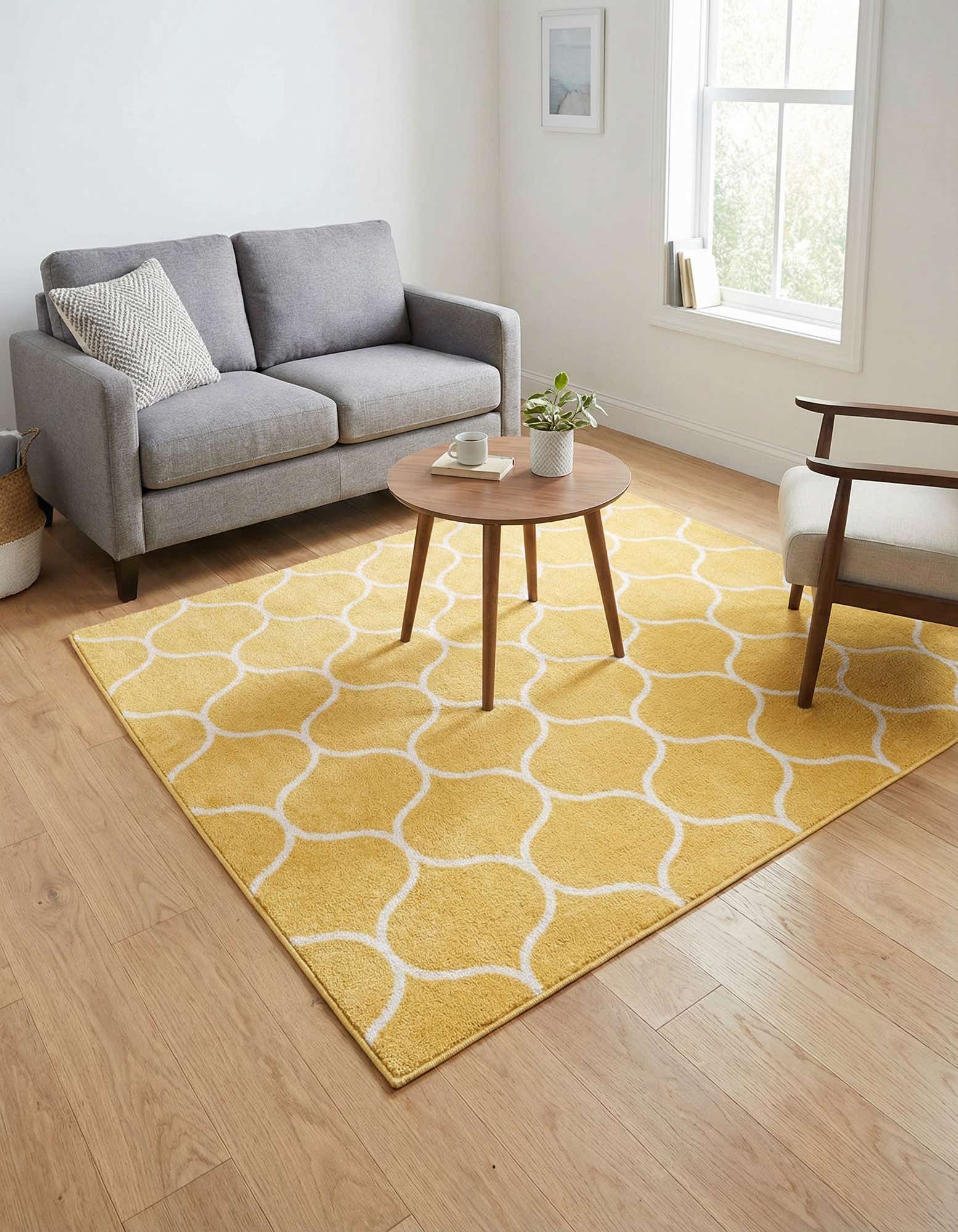 A lively curvilinear lattice in ivory overlays a warm yellow ground, creating a clean, modern geometric that brings energy without dominating a room. The repeating teardrop-shaped motif has a soft, hand-crafted look while remaining structured and symmetrical. Machine-made from 100% polypropylene, the pile has a slightly textured, plush feel underfoot that adds warmth and subtle depth to hard-surfaced floors.