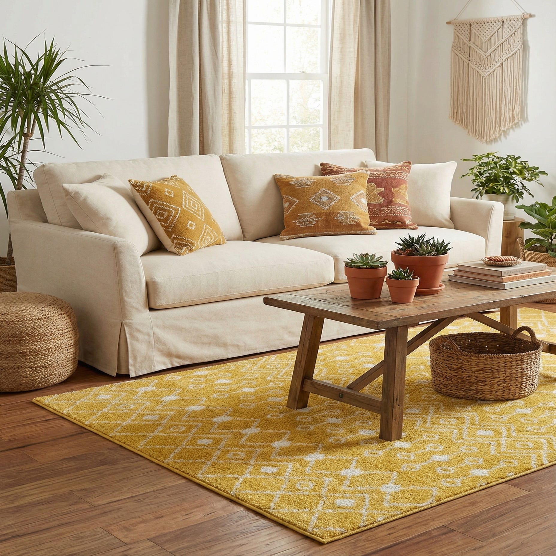 A 5' 3 x 5' 3 square yellow area rug with a white bohemian trellis pattern, suitable for indoor use.