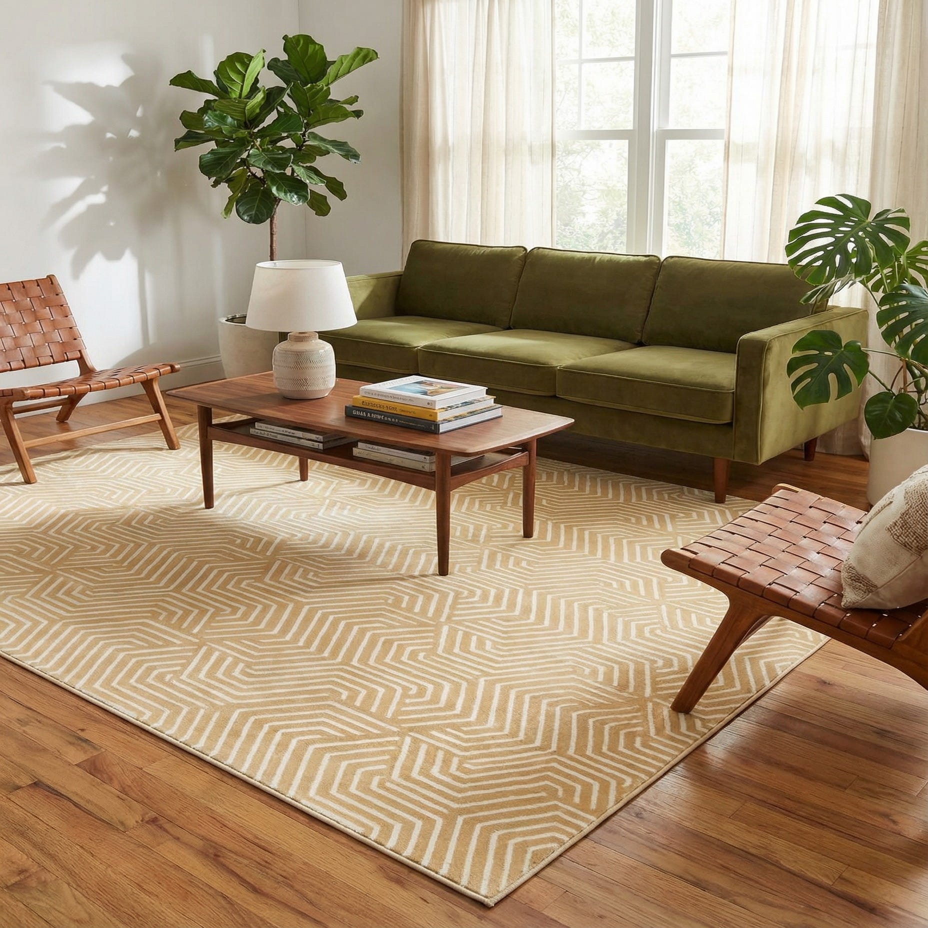 A lively geometric pattern of nested, hexagonal lines in clean ivory sits against a warm yellow field, creating a modern, graphic look that brings movement to a room without overwhelming it. The repeating linear motif reads contemporary with a touch of mid-century influence, and the bright yellow background pairs easily with natural woods, warm neutrals, or cool grays to create a balanced palette.