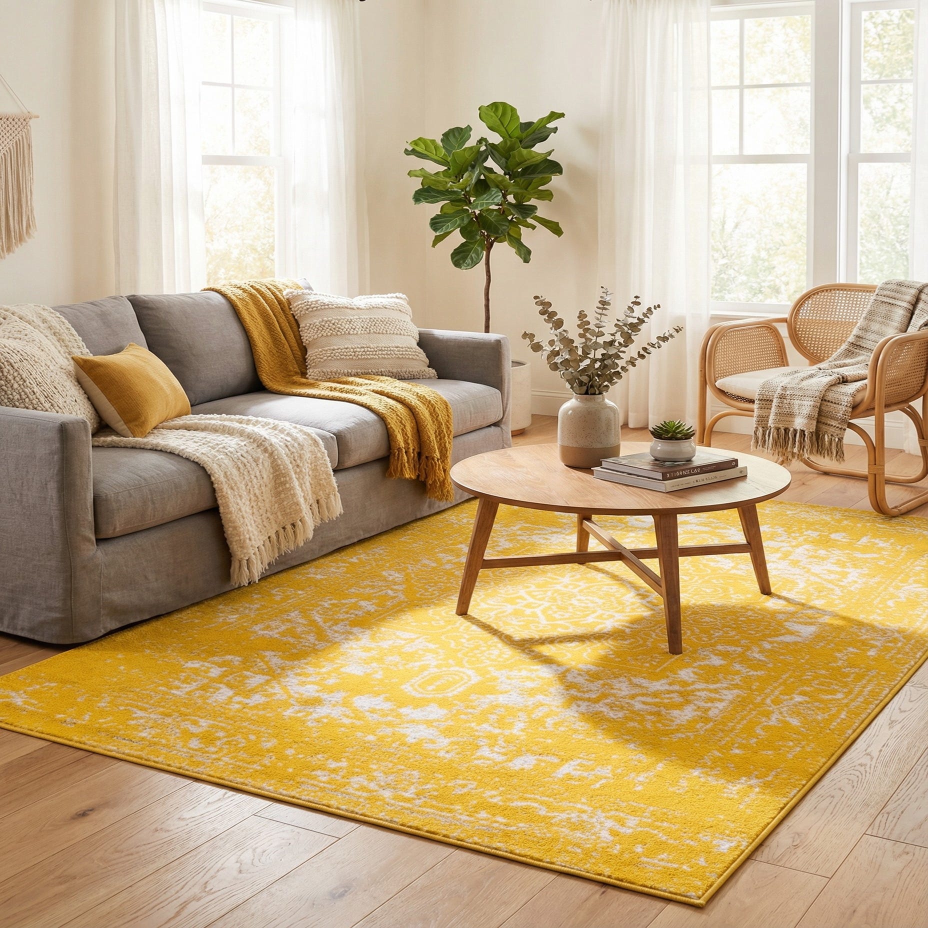 A bright yellow ground gives this rug an immediate sense of warmth while an ivory medallion floats at the center in a softened, distressed treatment. The pattern blends traditional Persian-inspired motifs with a painterly, worn effect that breaks up the design for a more casual, lived-in look. The surface is low-profile and smooth to the touch, with tightly woven polypropylene fibers that read as gently cushioned underfoot while keeping the pattern crisp.