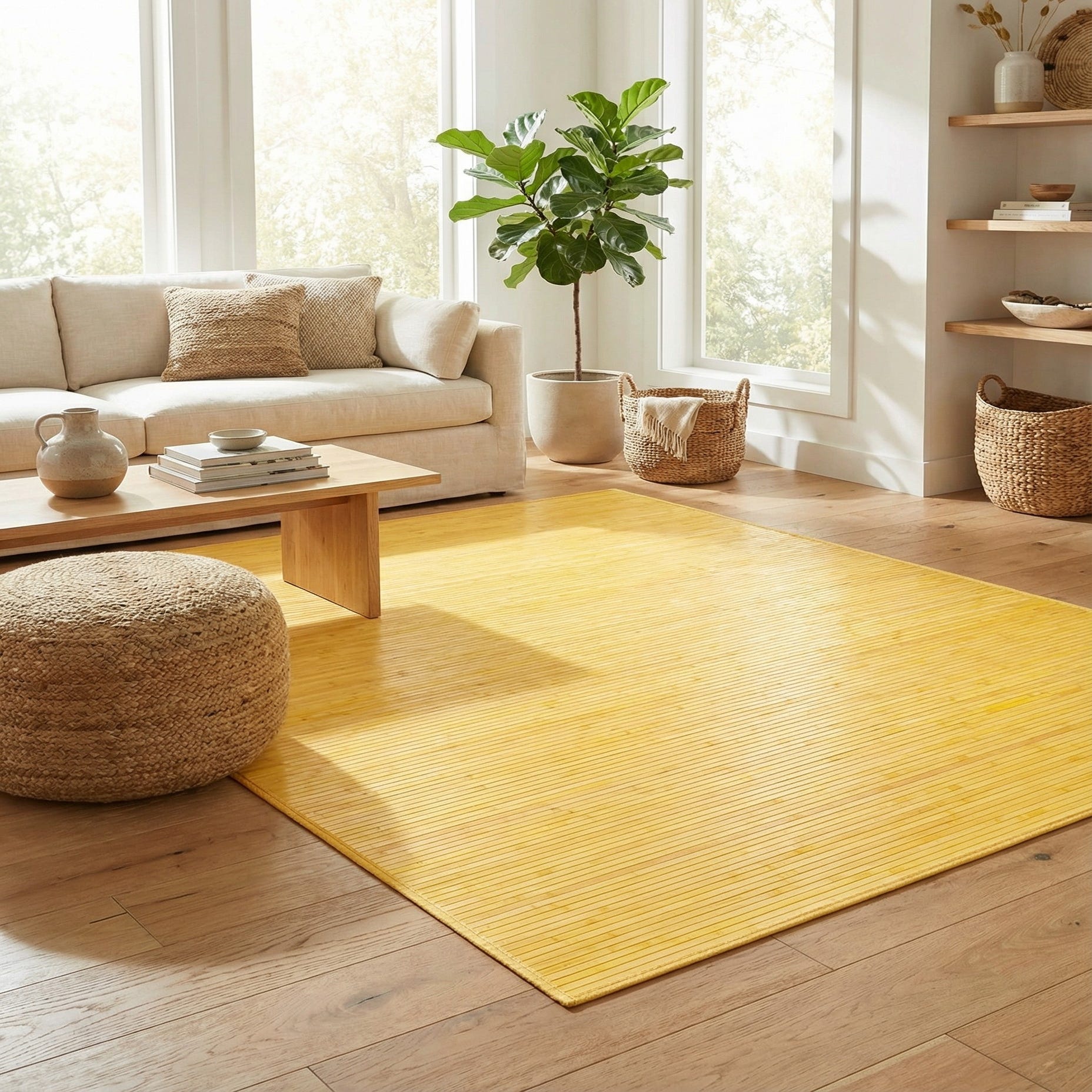 A 5x8 rectangular yellow bamboo rug with a modern, solid pattern, suitable for various indoor rooms.