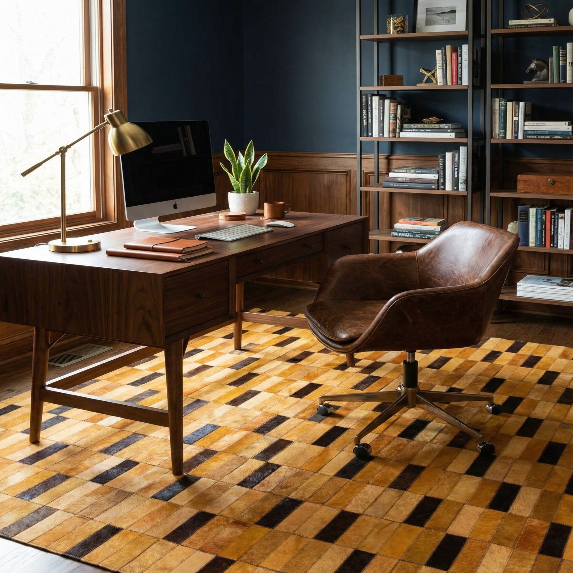A 5x8 rectangular Cowhide Patchwork rug featuring a modern pattern of alternating yellow/gold and dark brown rectangular patches.