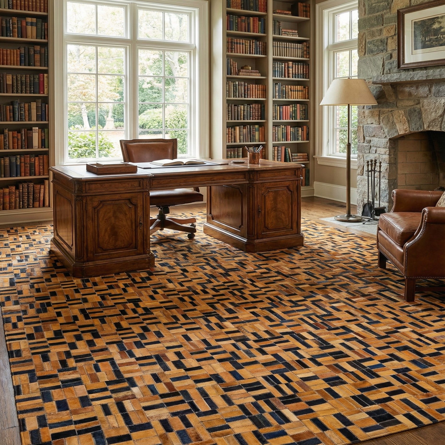 Handmade from cowhide and leather, this patchwork rug arranges small rectangular panels into a tight geometric grid that reads like a modern basket-weave. A warm yellow background anchors the design while bands of black, navy blue and orange form bold linear accents across the surface. The sewn seams and natural hair-on-hide lend a tactile quality—soft yet slightly varied in nap—with a low sheen and visible grain that adds depth to the pattern.