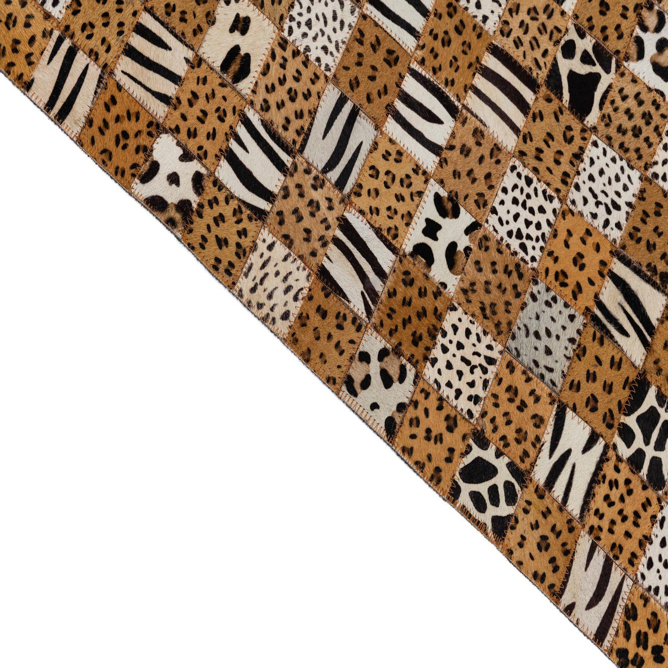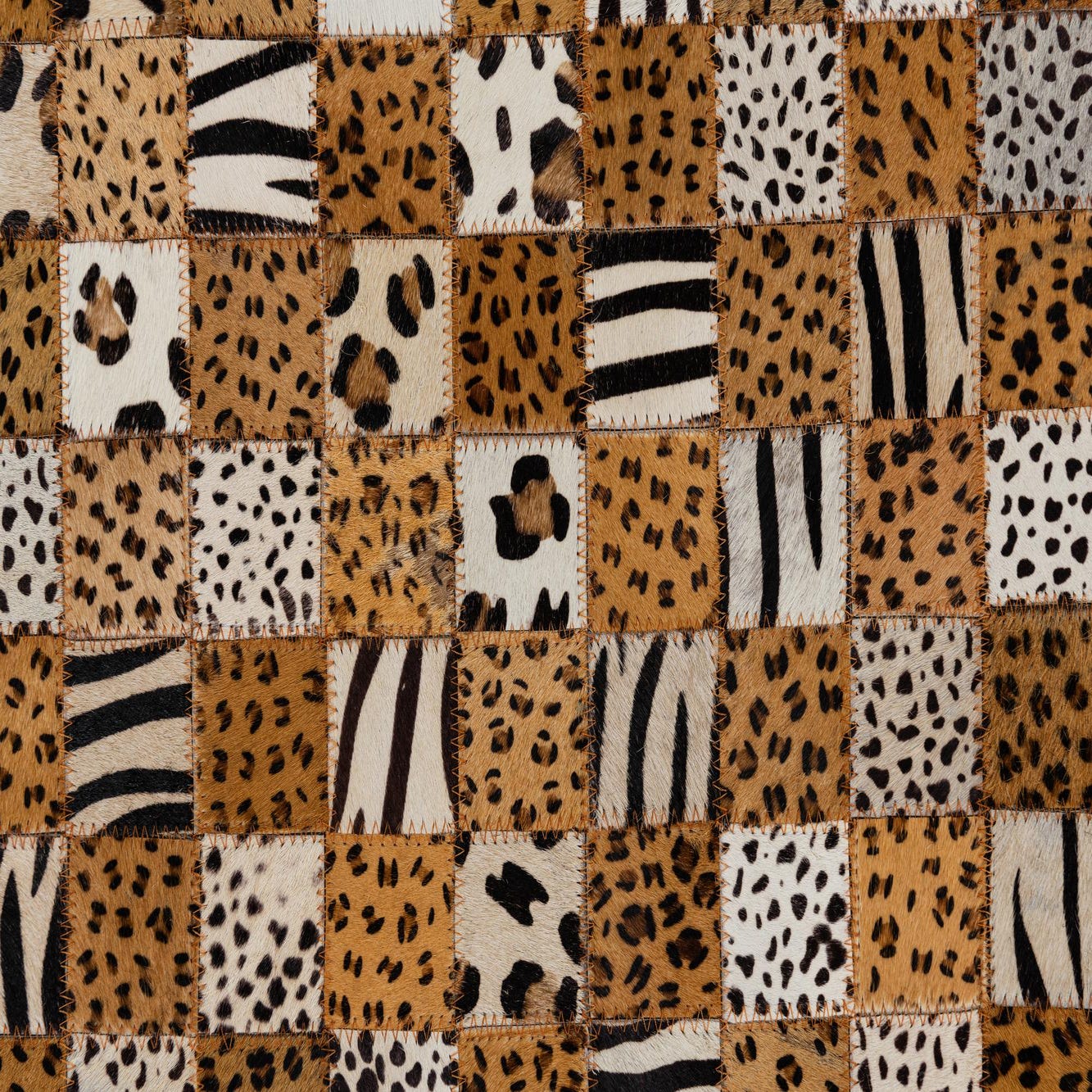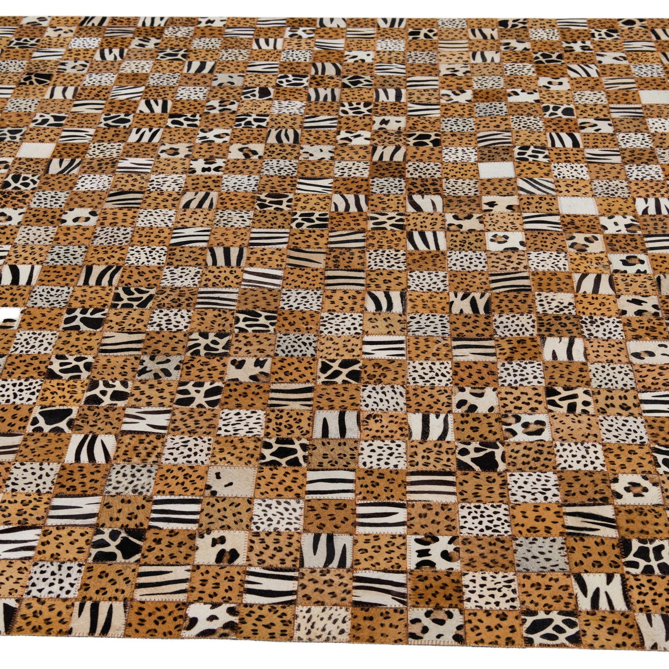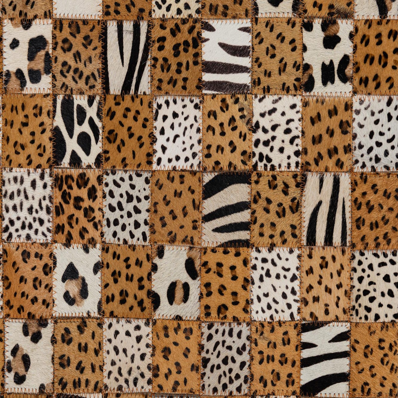 The distinct design and natural materials make this rug a fitting statement piece for interiors following an eclectic, bohemian, or rustic aesthetic. It can also serve as an eye-catching focal point in a modern minimalist space where its pattern contrasts sharply against a subdued palette. Consider placing this rug in well-appointed living rooms, cozy home libraries, or chic bedrooms to add warmth and visual interest. The Cowhide Leather rug's robust palette and intricate detailing make it versatile enough to harmonize with various wood finishes and leather furnishings.
