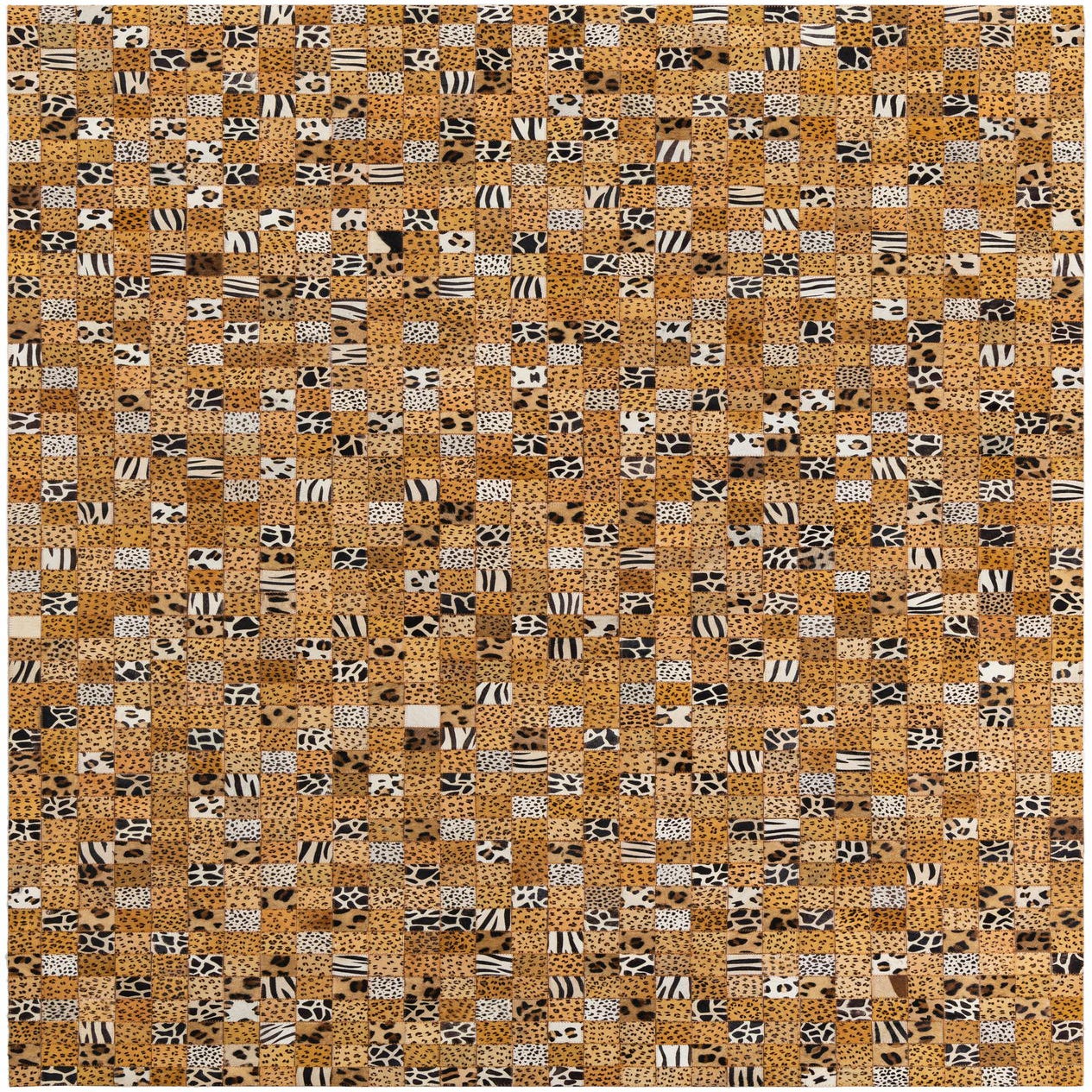 A 5x8 rectangular Cowhide Leather rug featuring a modern patchwork of yellow and gold animal prints, including leopard, cheetah, and zebra patterns.