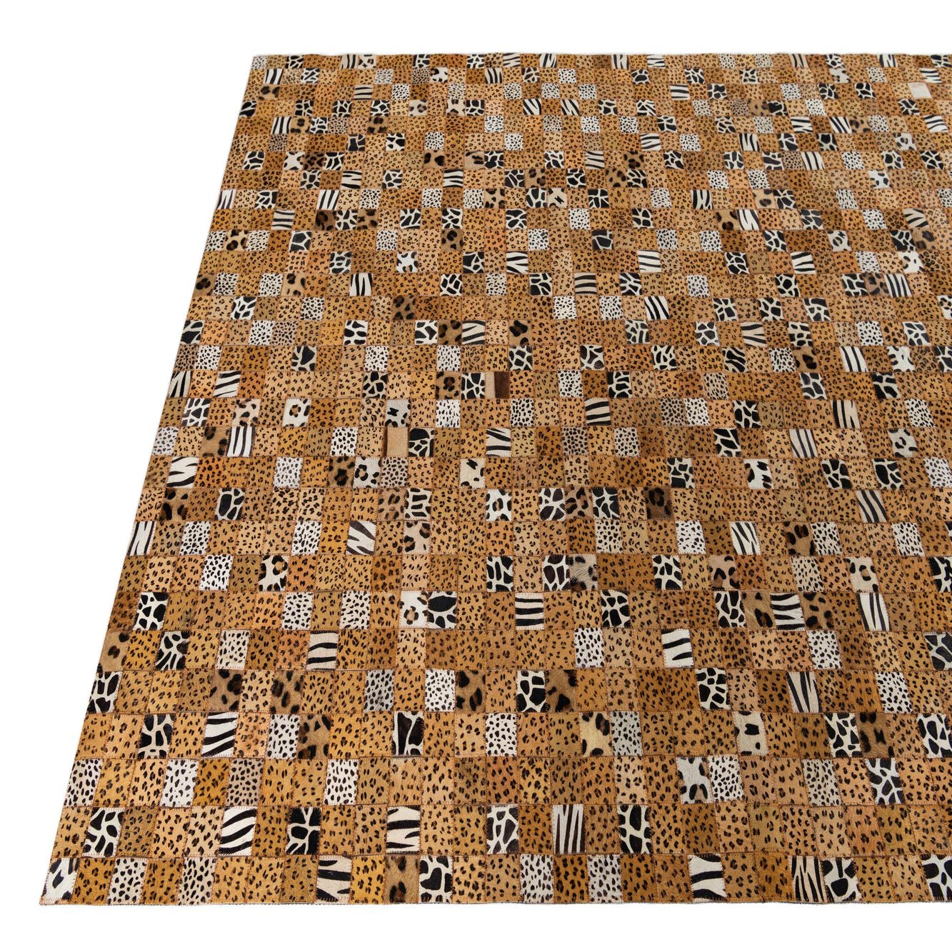 A 5x8 rectangular patchwork rug made from cowhide and leather, featuring a mix of yellow and gold leopard print, zebra stripes, and dalmatian spots.