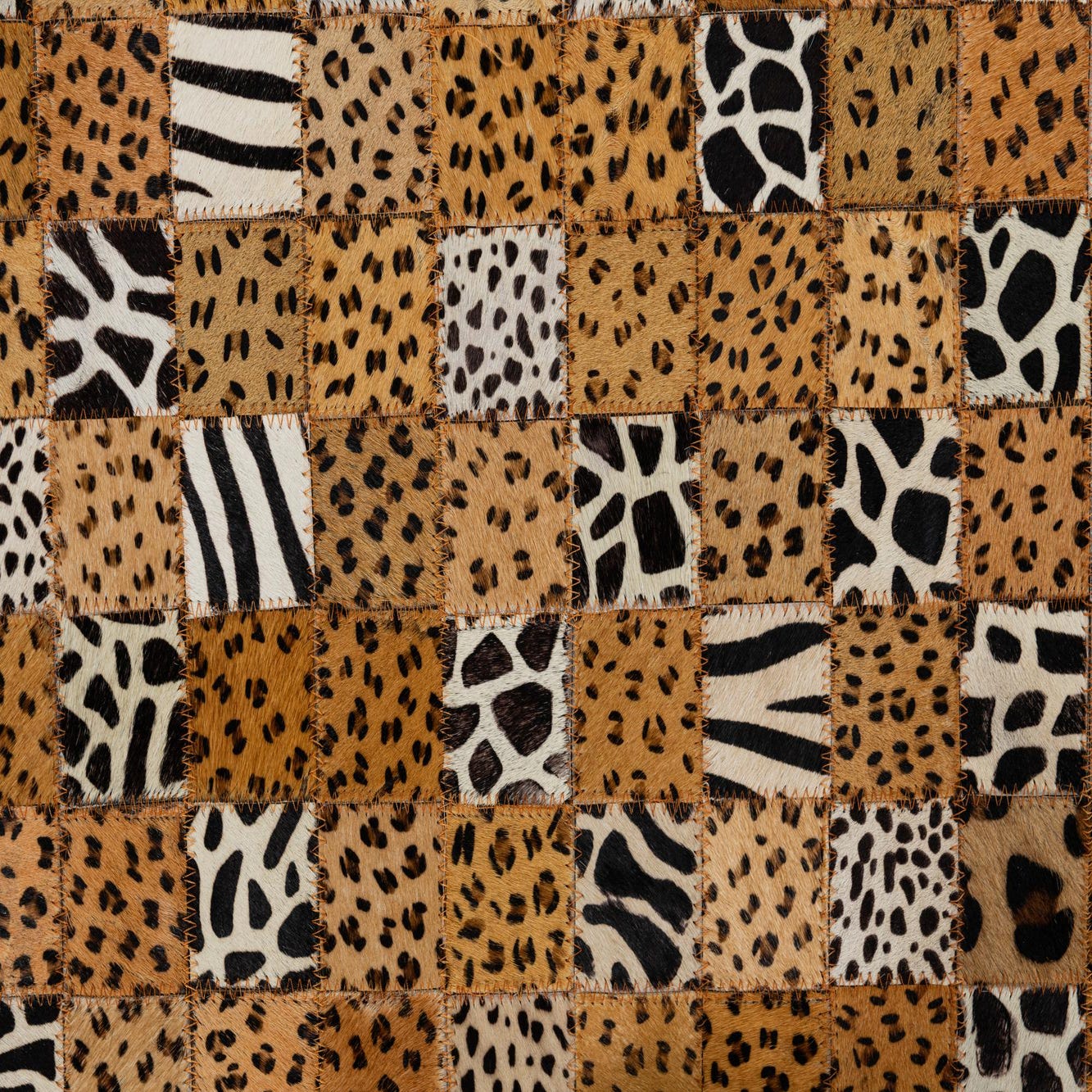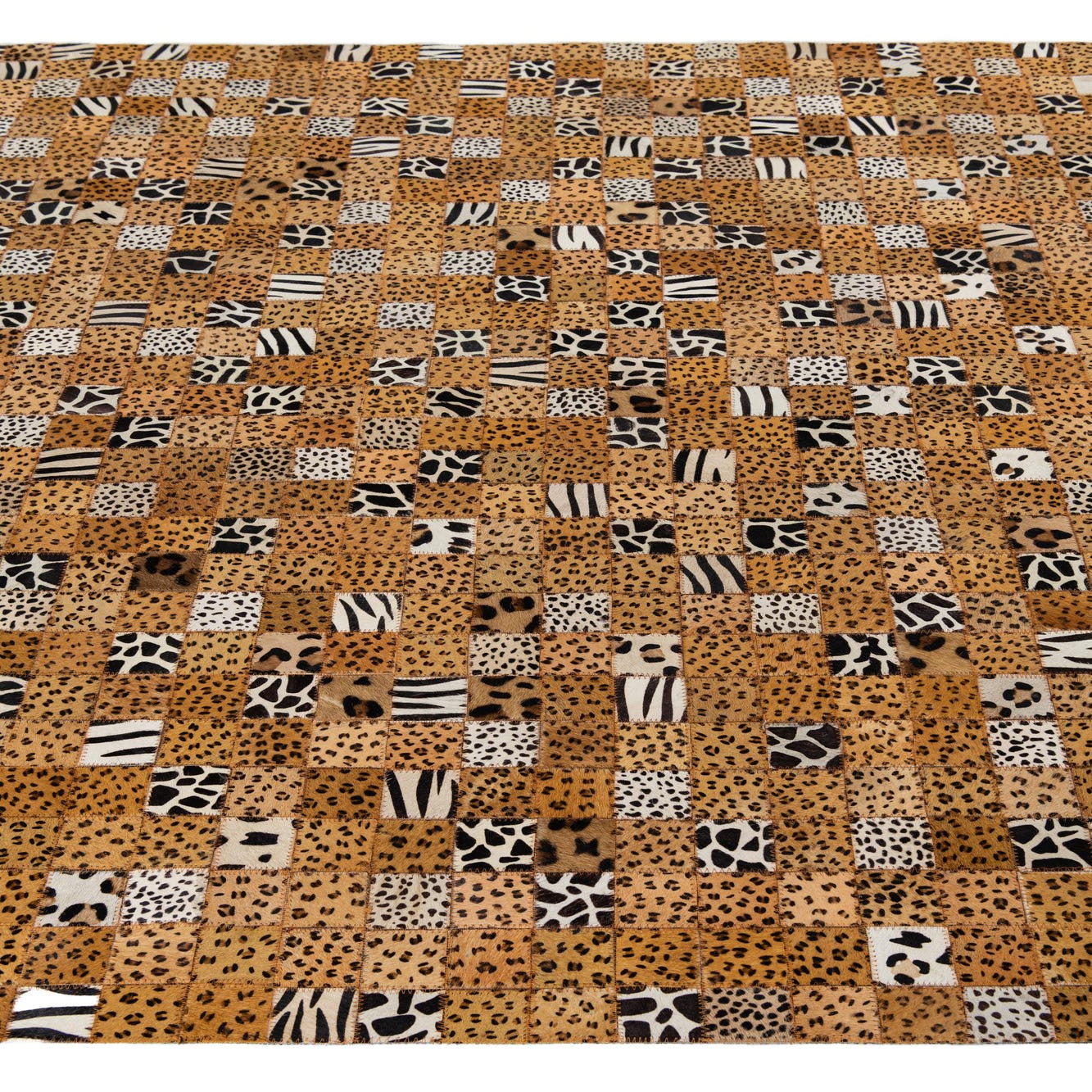 This Cowhide Leather collection rug embodies a unique patchwork design composed of various animal prints, ranging from leopard spots to zebra stripes. The colors seamlessly blend natural hues of yellow, black, brown, ivory, and tan with a dominant yellow background, creating a vibrant yet grounded aesthetic. The 5x8 hand-made piece is crafted from genuine cowhide and leather, giving it a rich texture and organic feel underfoot.