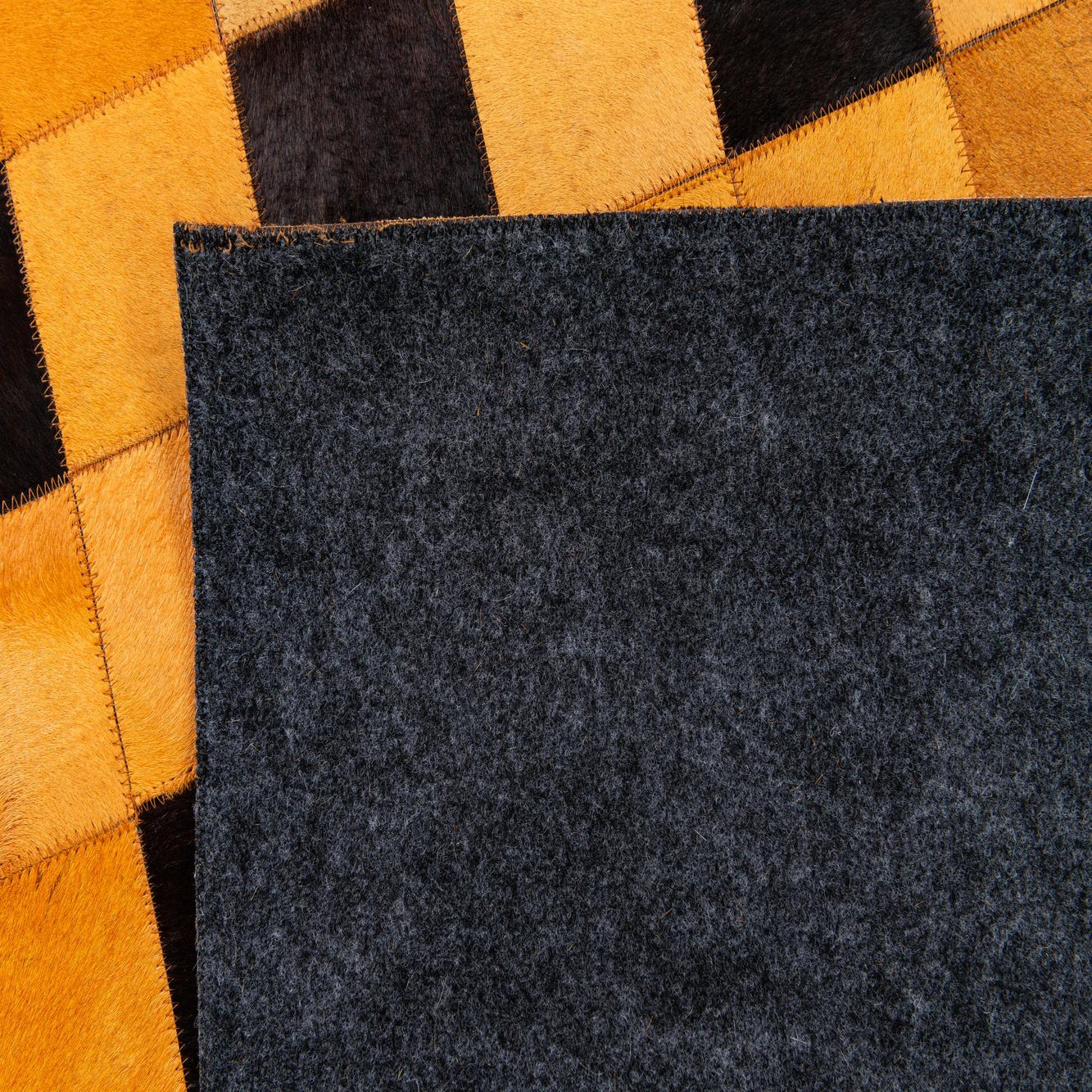 A rectangular 5x8 modern cowhide rug featuring a checkerboard pattern of alternating yellow/gold and dark brown/black squares.