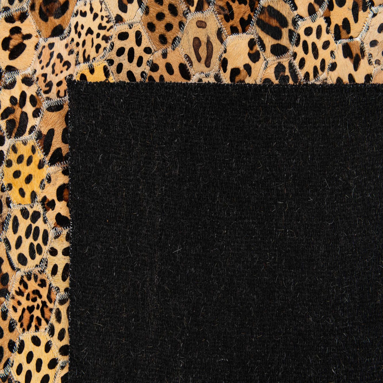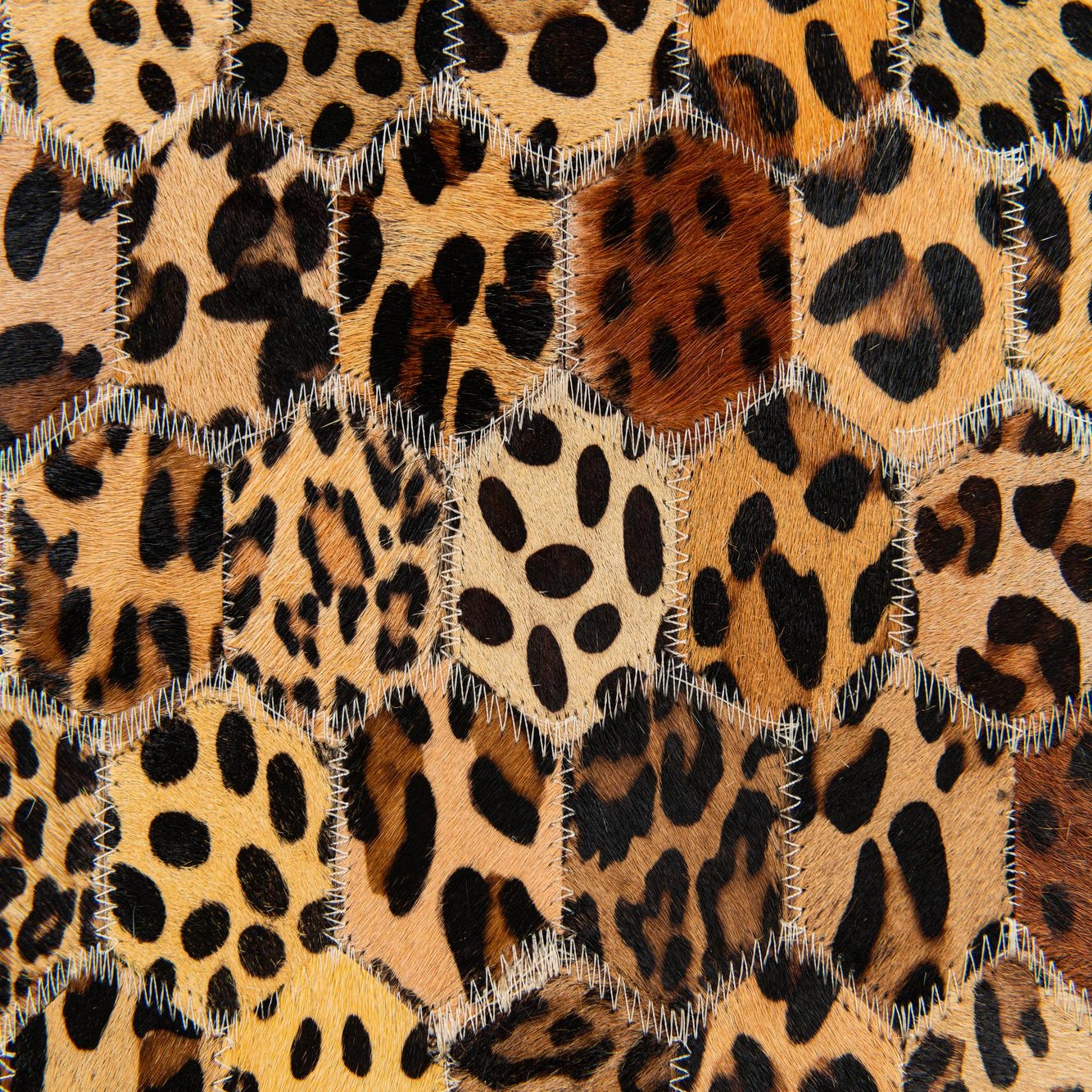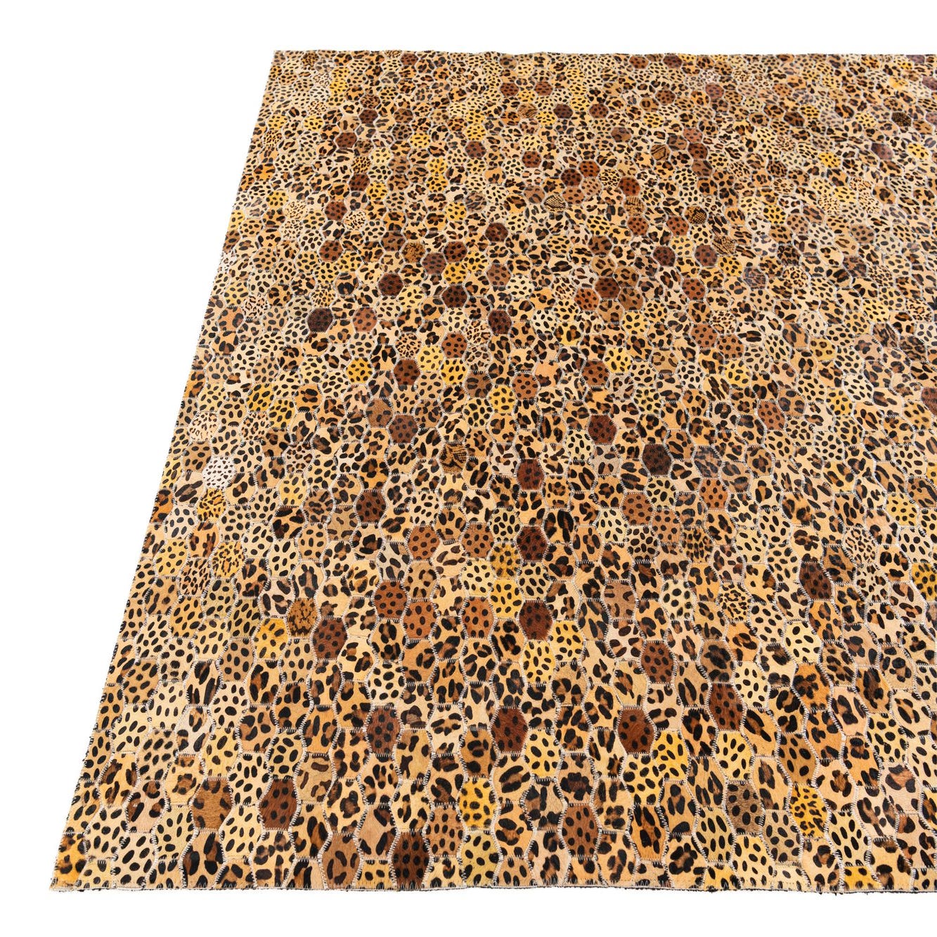 A rectangular 5x8 Cowhide Stocks rug featuring a modern leopard print pattern in various shades of yellow, gold, and brown.