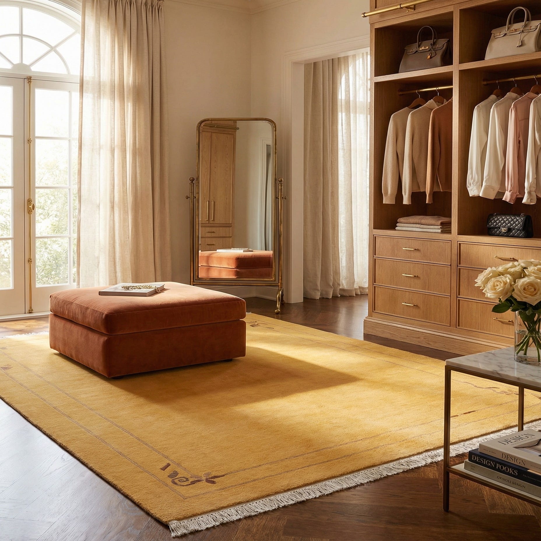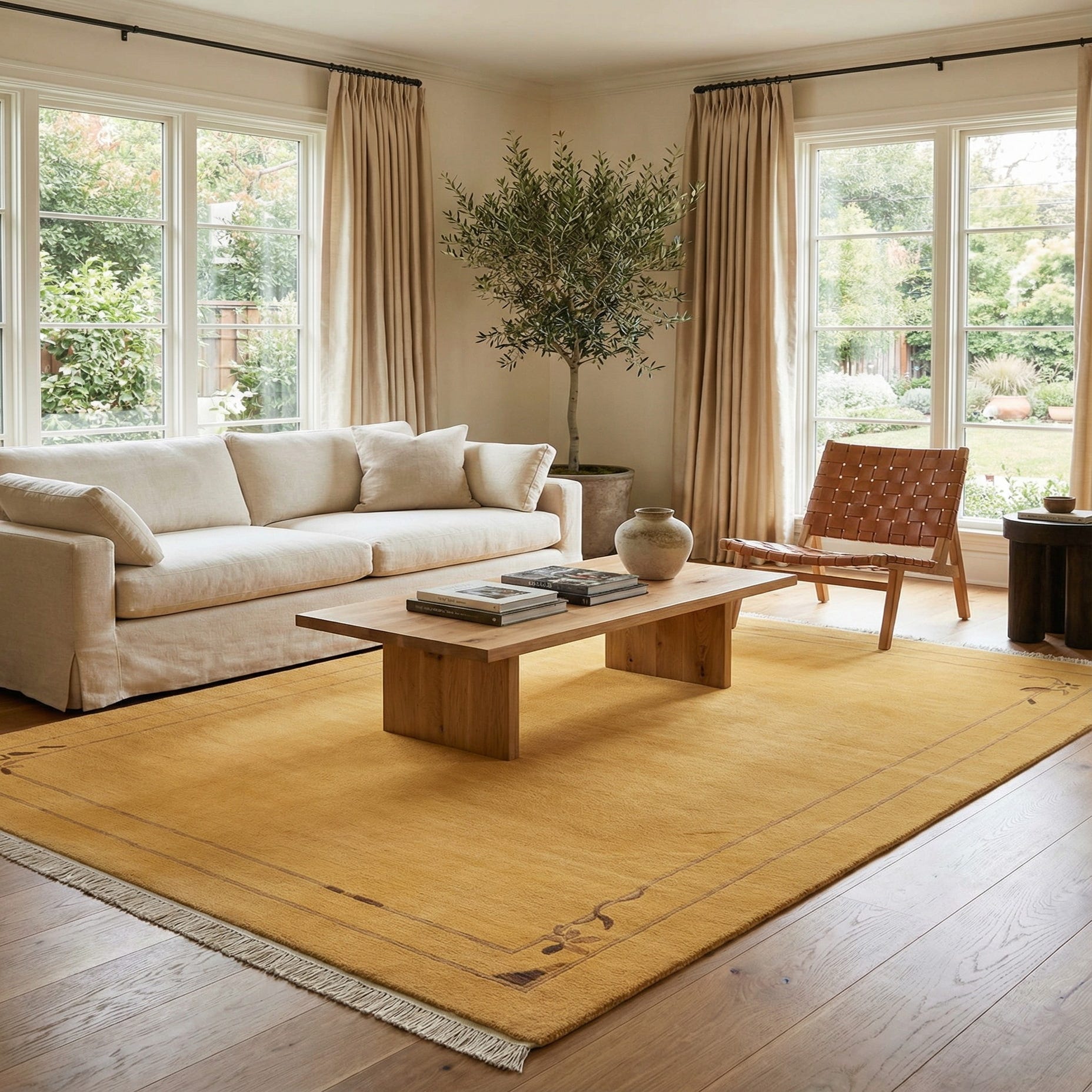Primary color is Yellow. Colors in this rug include: Yellow, Brown, Tan.