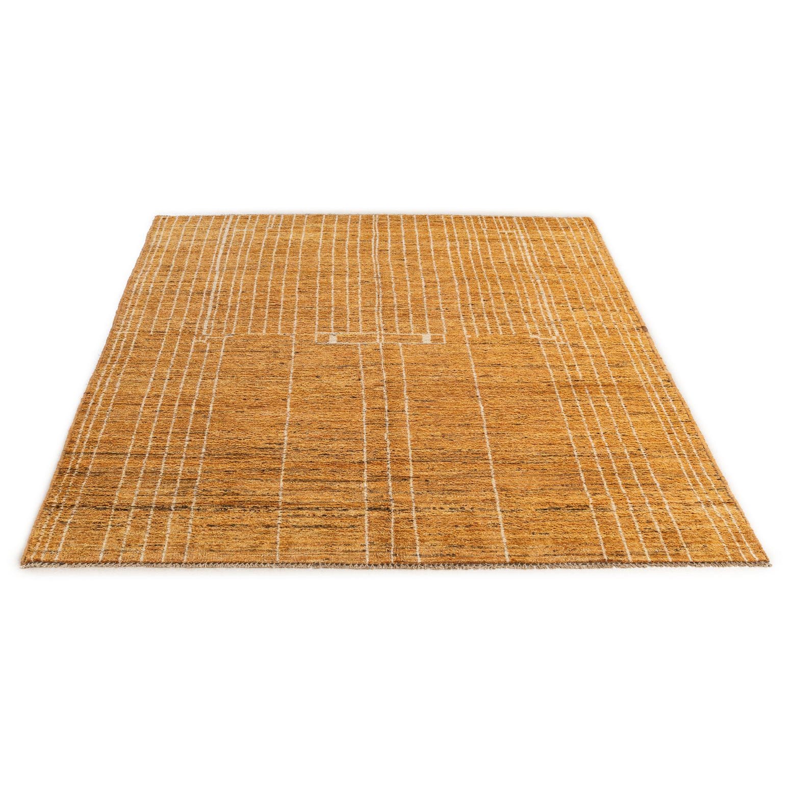 A 5x8 rectangular Darya rug in yellows and golds with a modern striped pattern, handmade from wool.