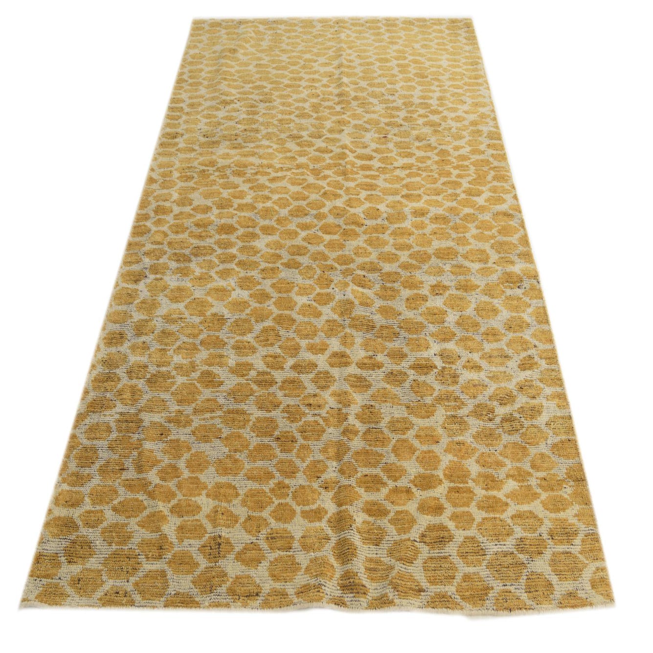 The Darya collection presents a hand-knotted rug crafted from 100% wool in a 5x8 size, showcasing a dynamic, abstract pattern that offers a contemporary spin on classic designs. The pattern features an array of yellow and ivory hues, layered to create a visual depth that draws the eye. The yellow background provides a warm, inviting base for the organic shapes that seem to dance across the surface, offering a sense of movement and energy.