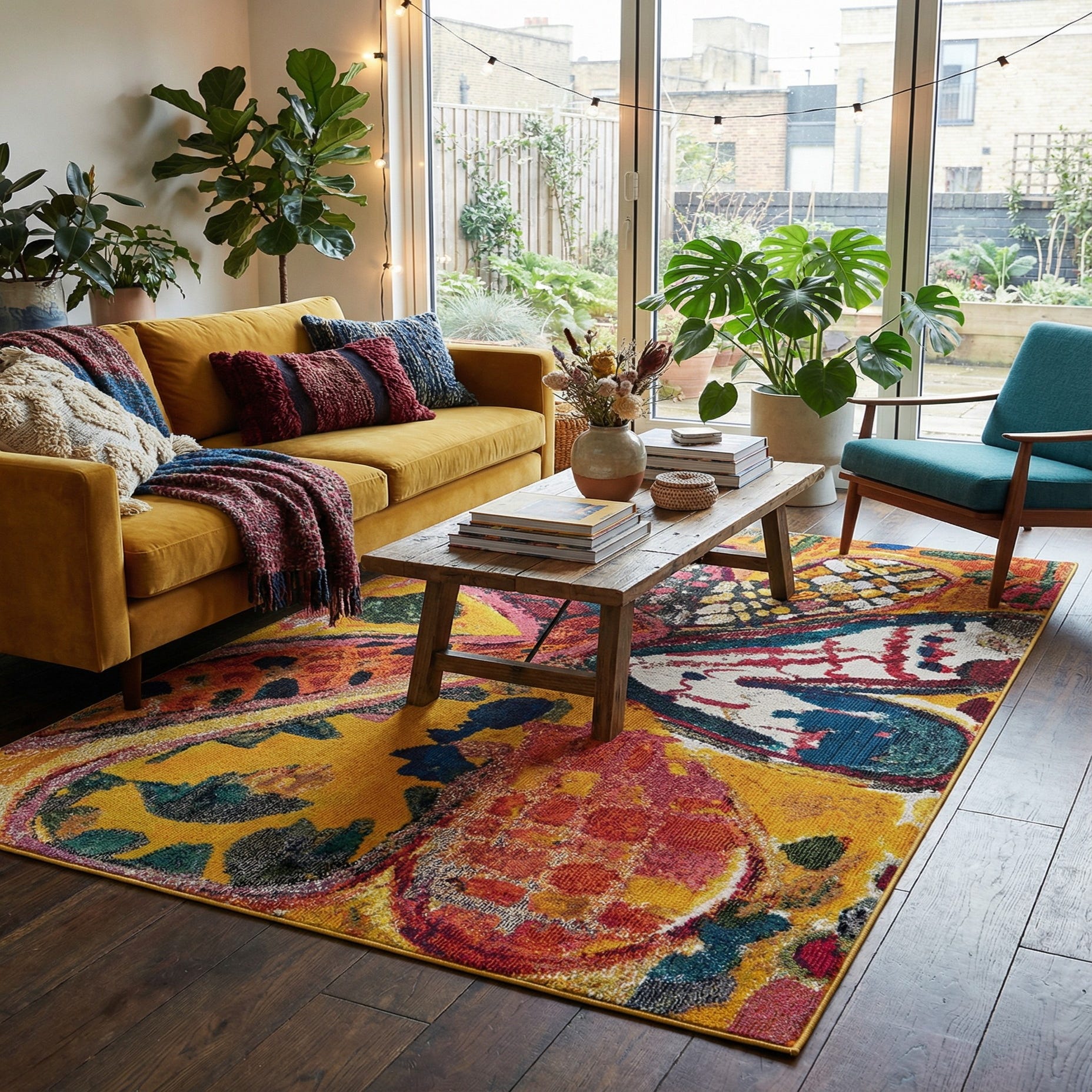 Primary color is Yellow. Colors in this rug include: Yellow, Blue, Brown, Ivory, Orange, Red, Olive, Navy Blue, Black.