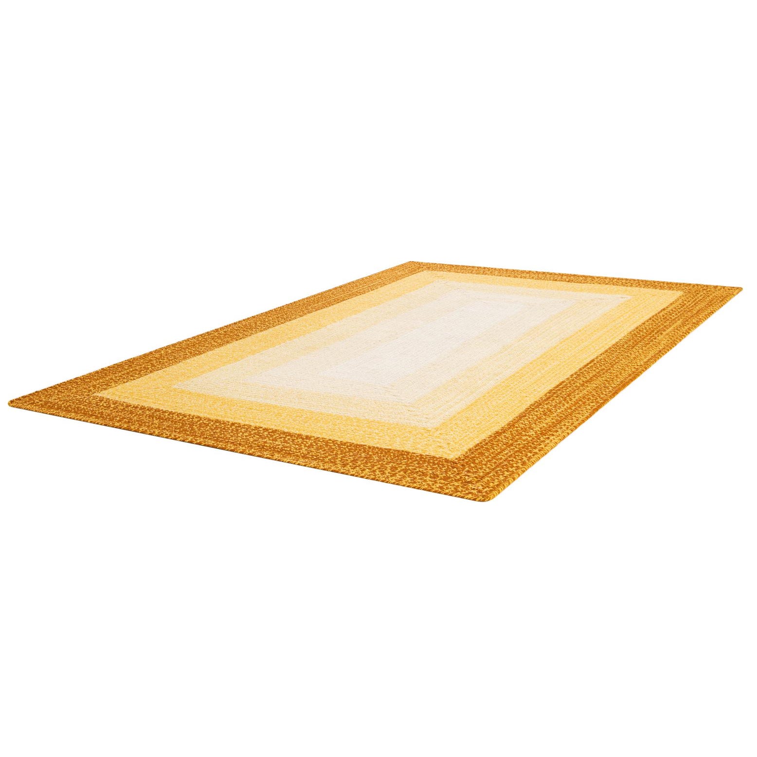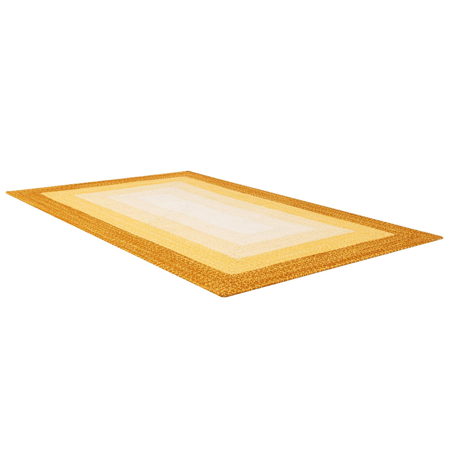 A 5x8 rectangular braided wool rug featuring a modern gradient of yellow and gold tones, perfect for an indoor living room.
