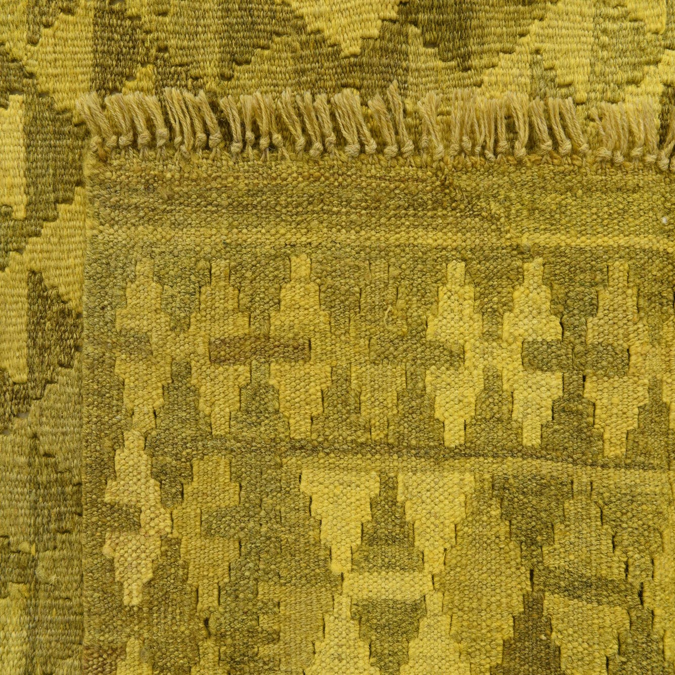 A 5x8 rectangular yellow and gold Kilim Fars flatweave rug with a tribal geometric pattern and fringed edges.