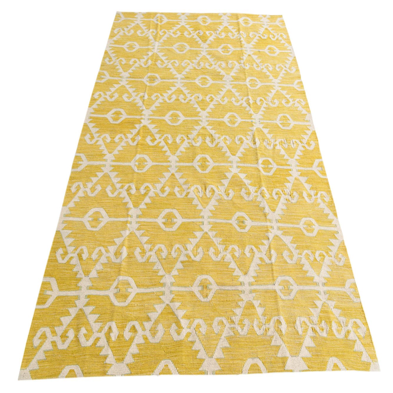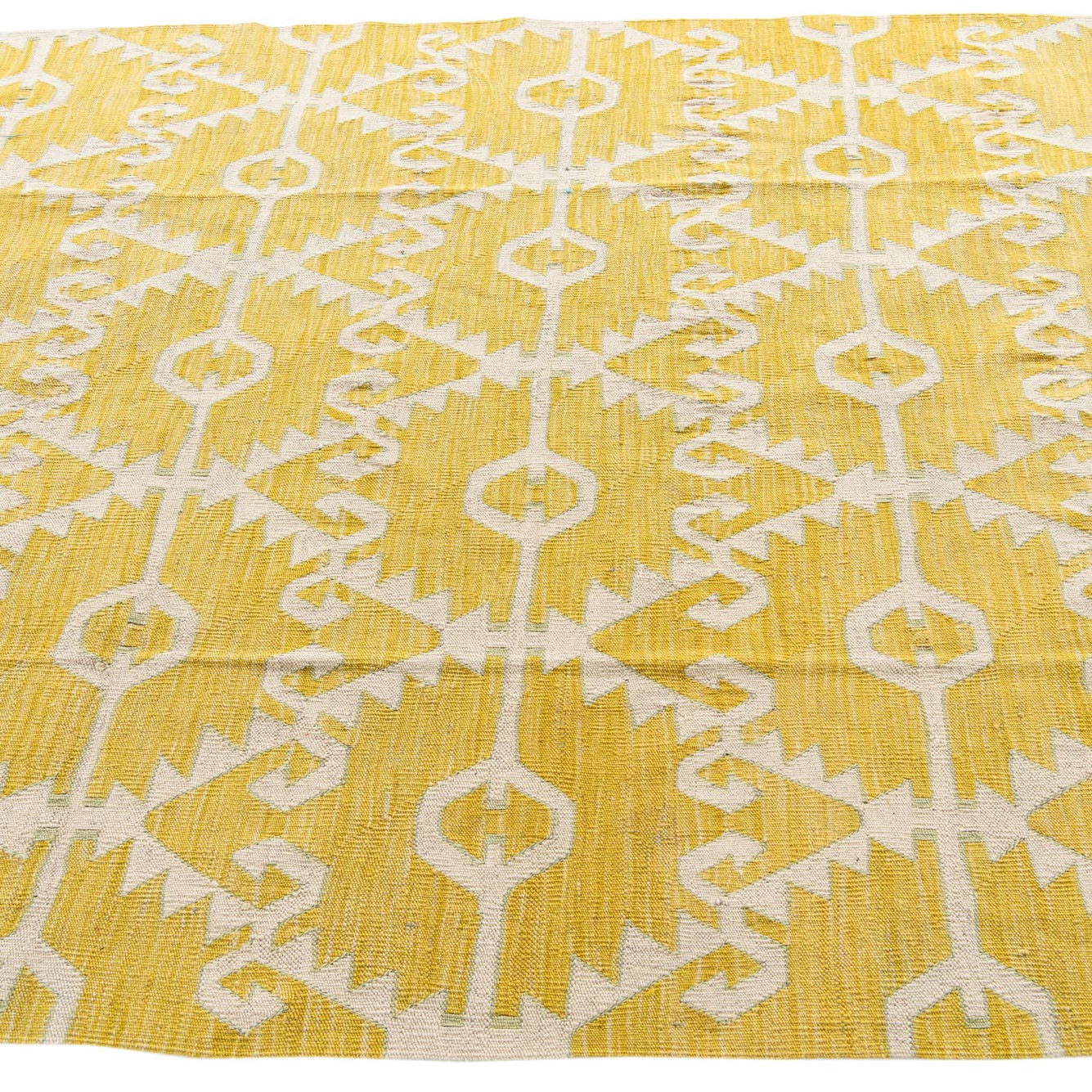 A 5x8 rectangular yellow and cream flatweave wool rug with a tribal geometric pattern, suitable for a living room.