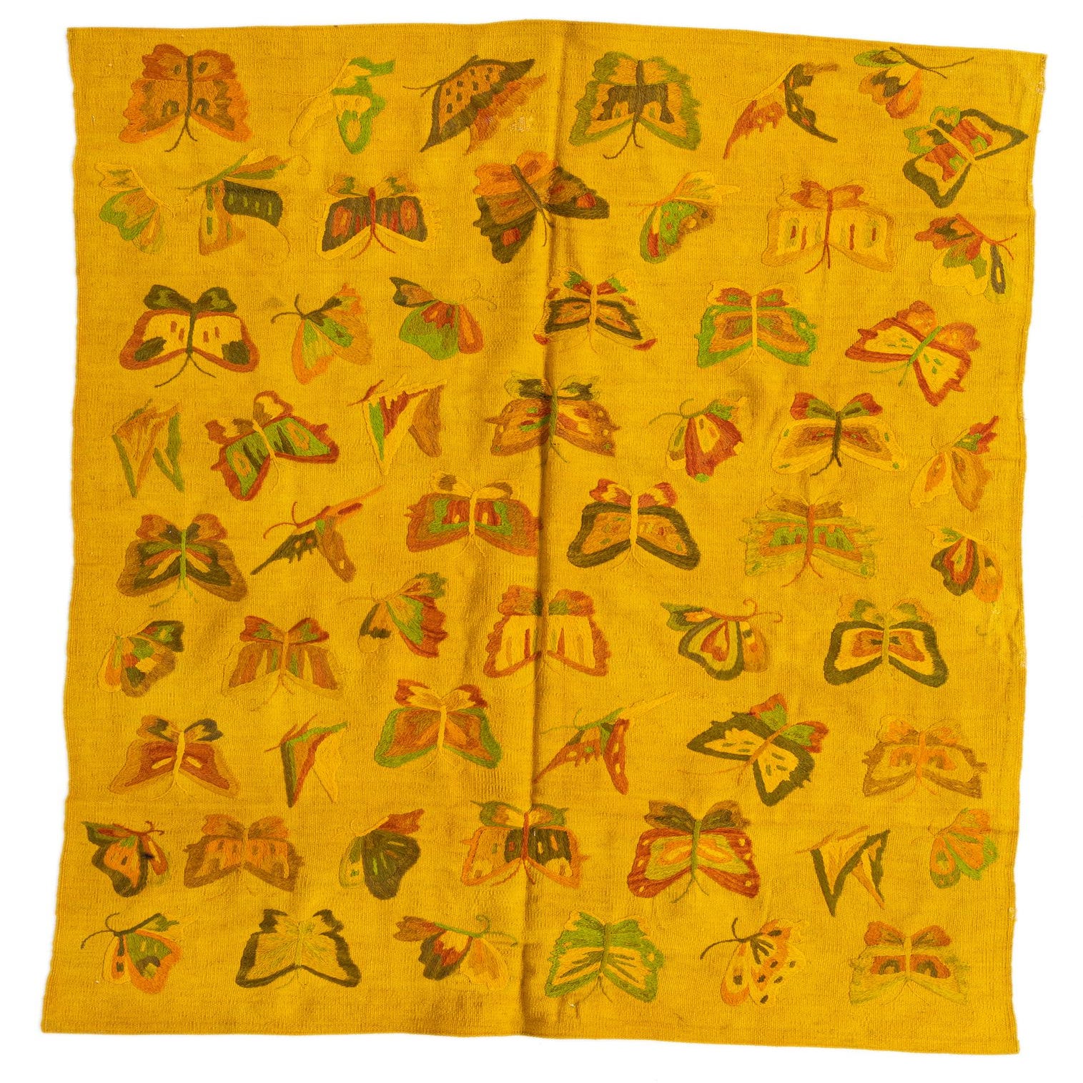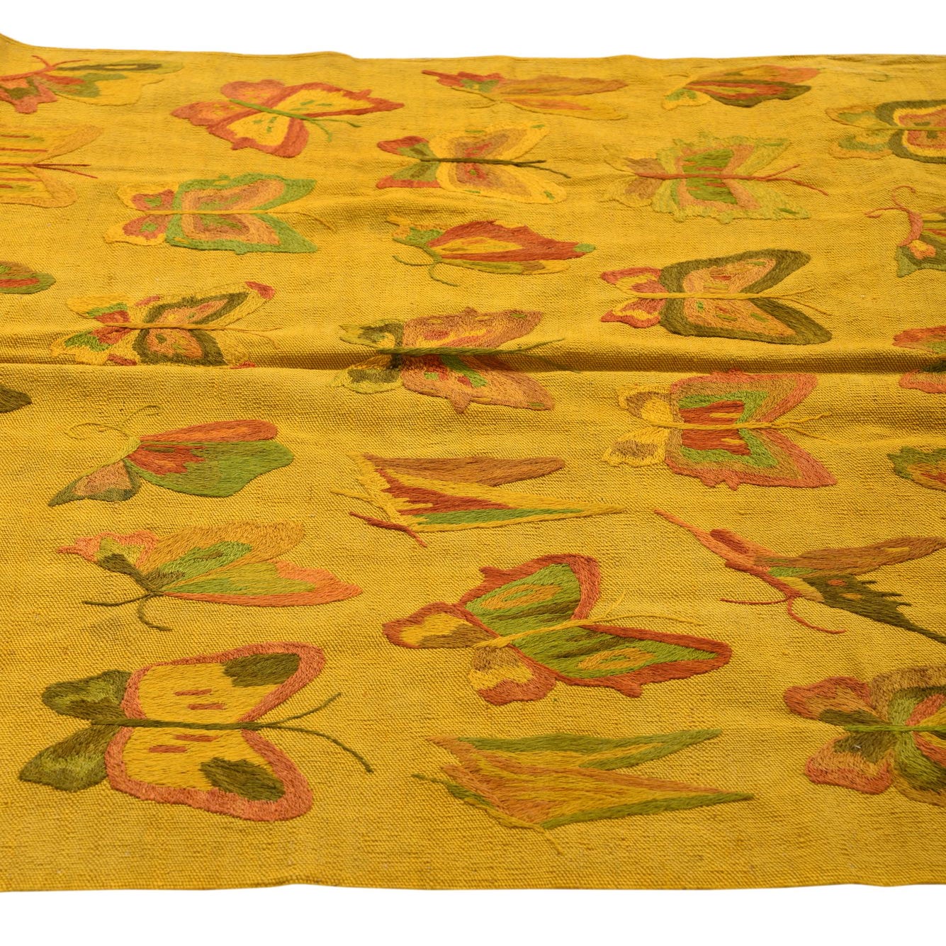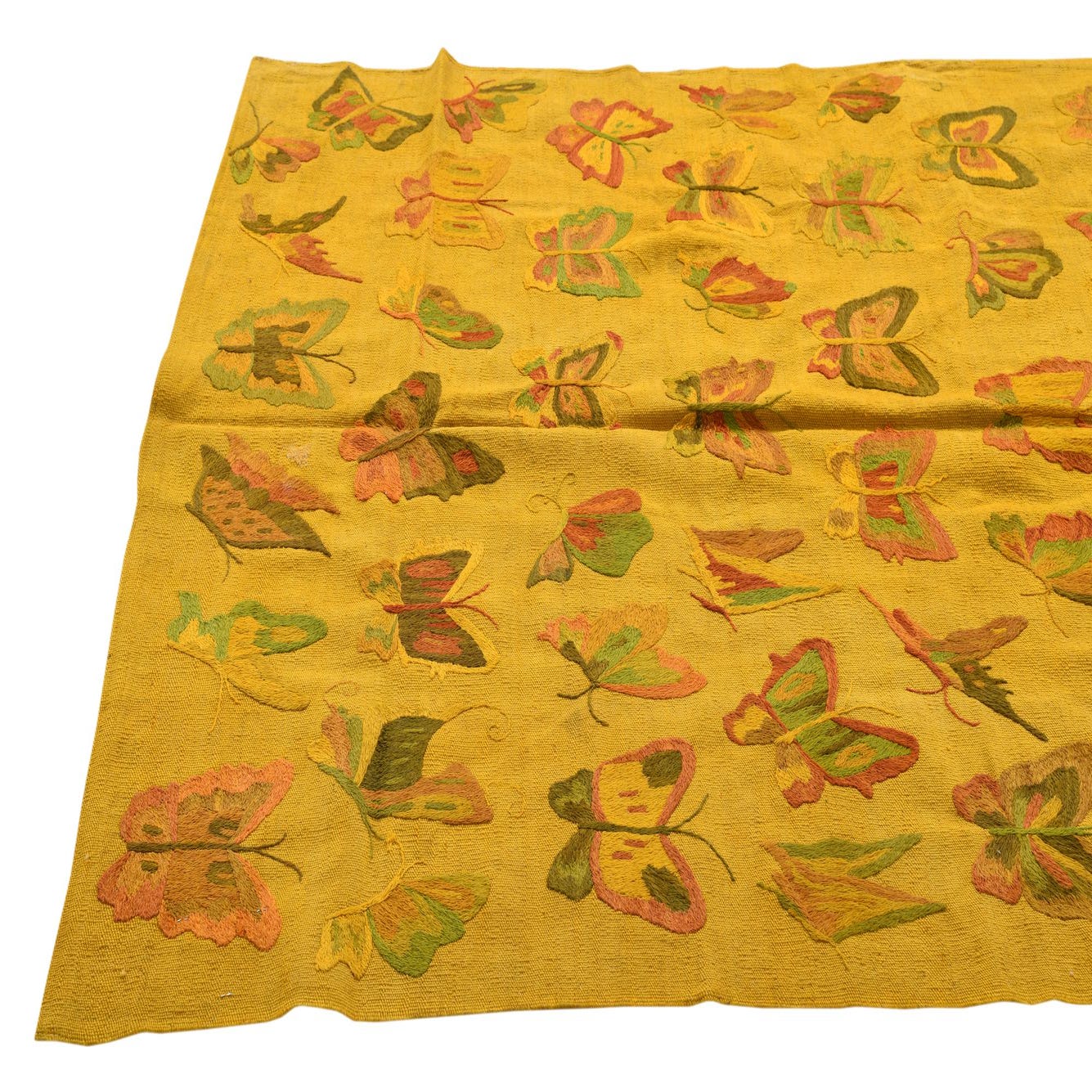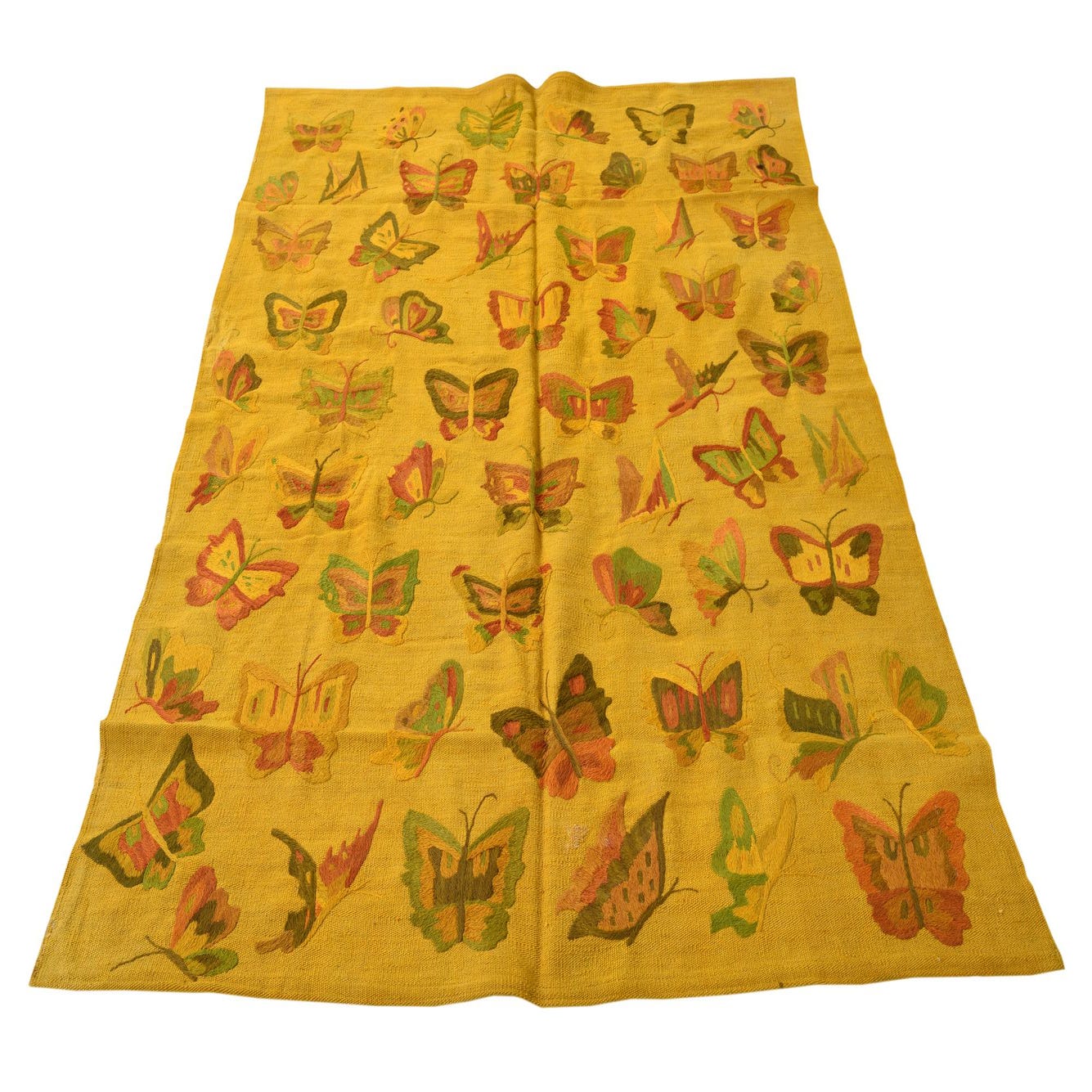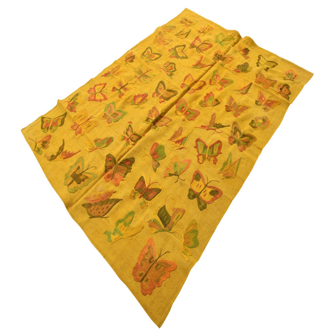 A 5x8 rectangular yellow flatweave wool rug featuring a vibrant, repeating pattern of colorful butterflies in various shades of green, orange, and brown.