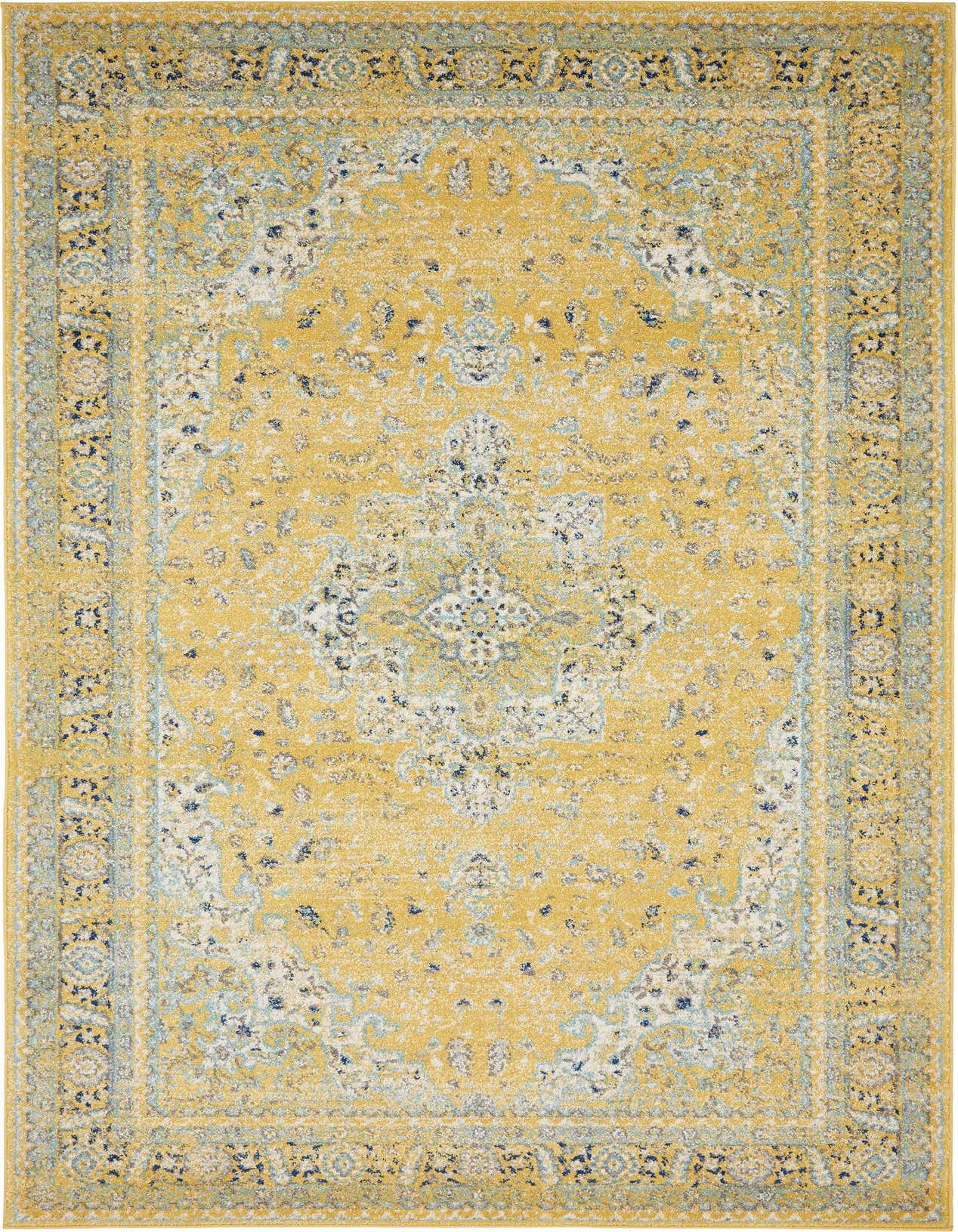 Primary color is Yellow. Colors in this rug include: Yellow, Gray, Ivory, Navy Blue, Turquoise.