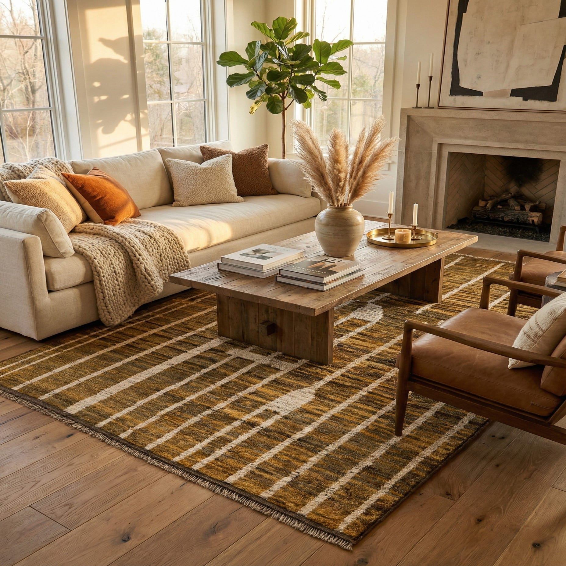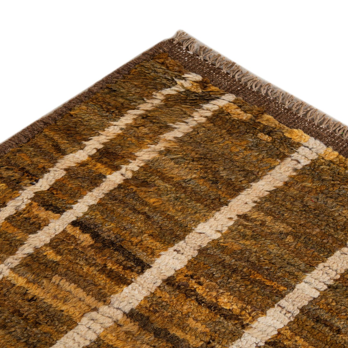A 5x8 rectangular yellow and brown tribal wool rug with thick cream vertical stripes and abstract shapes.