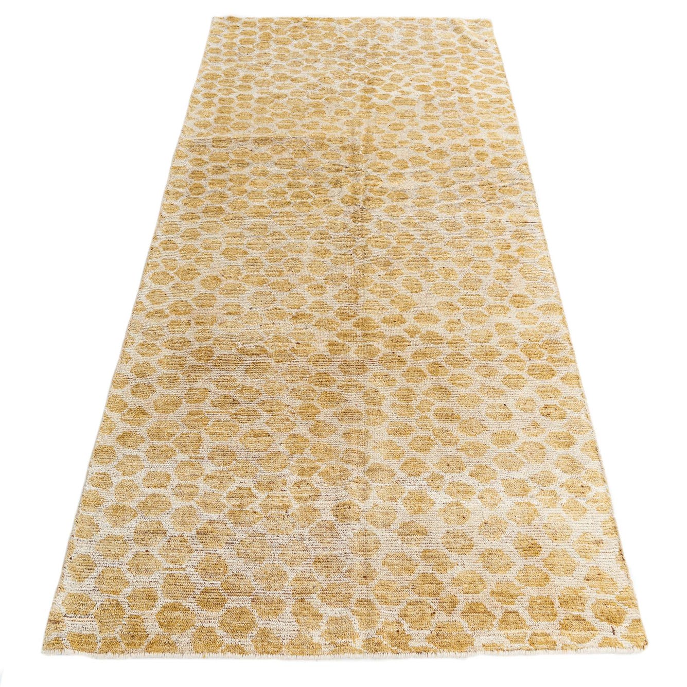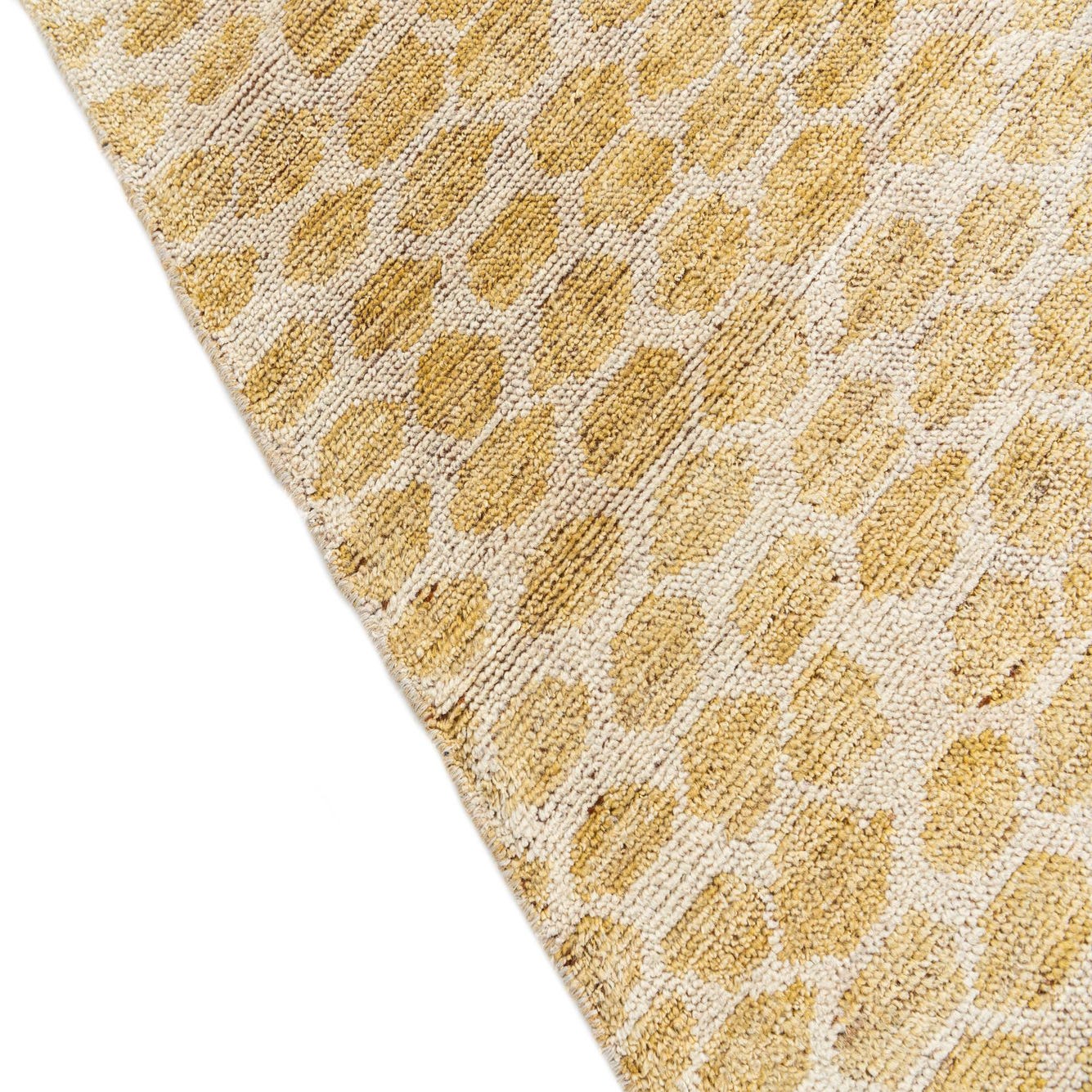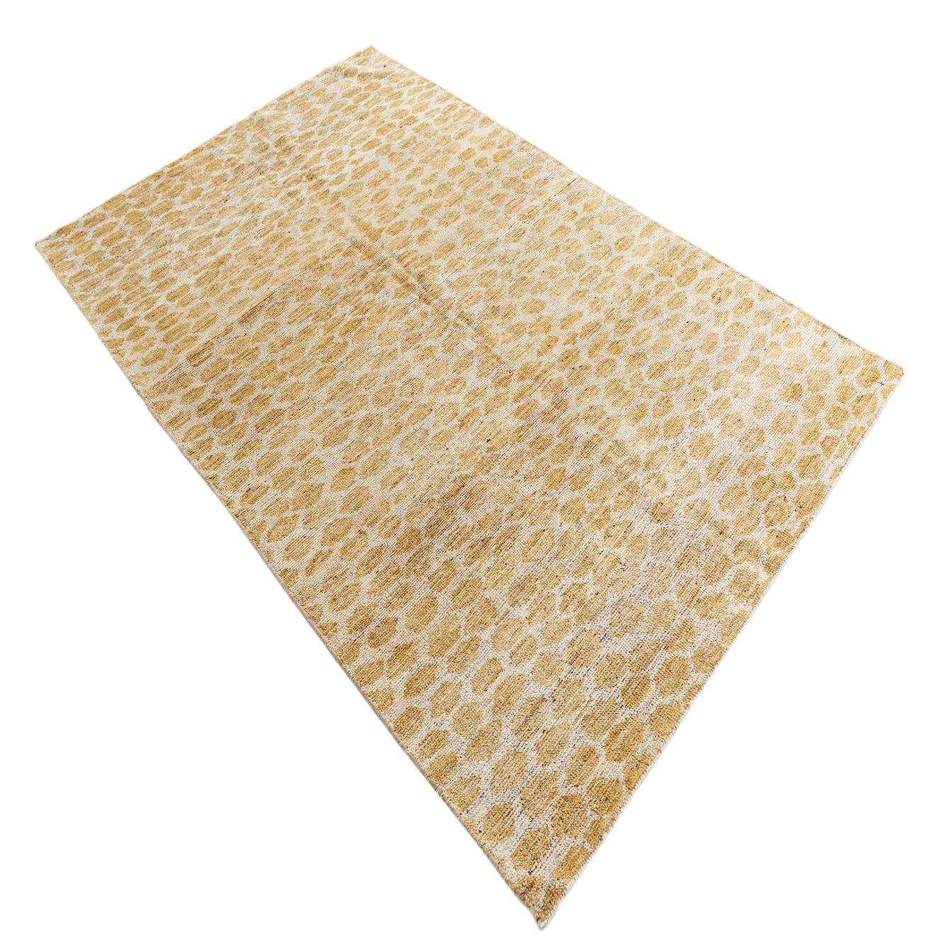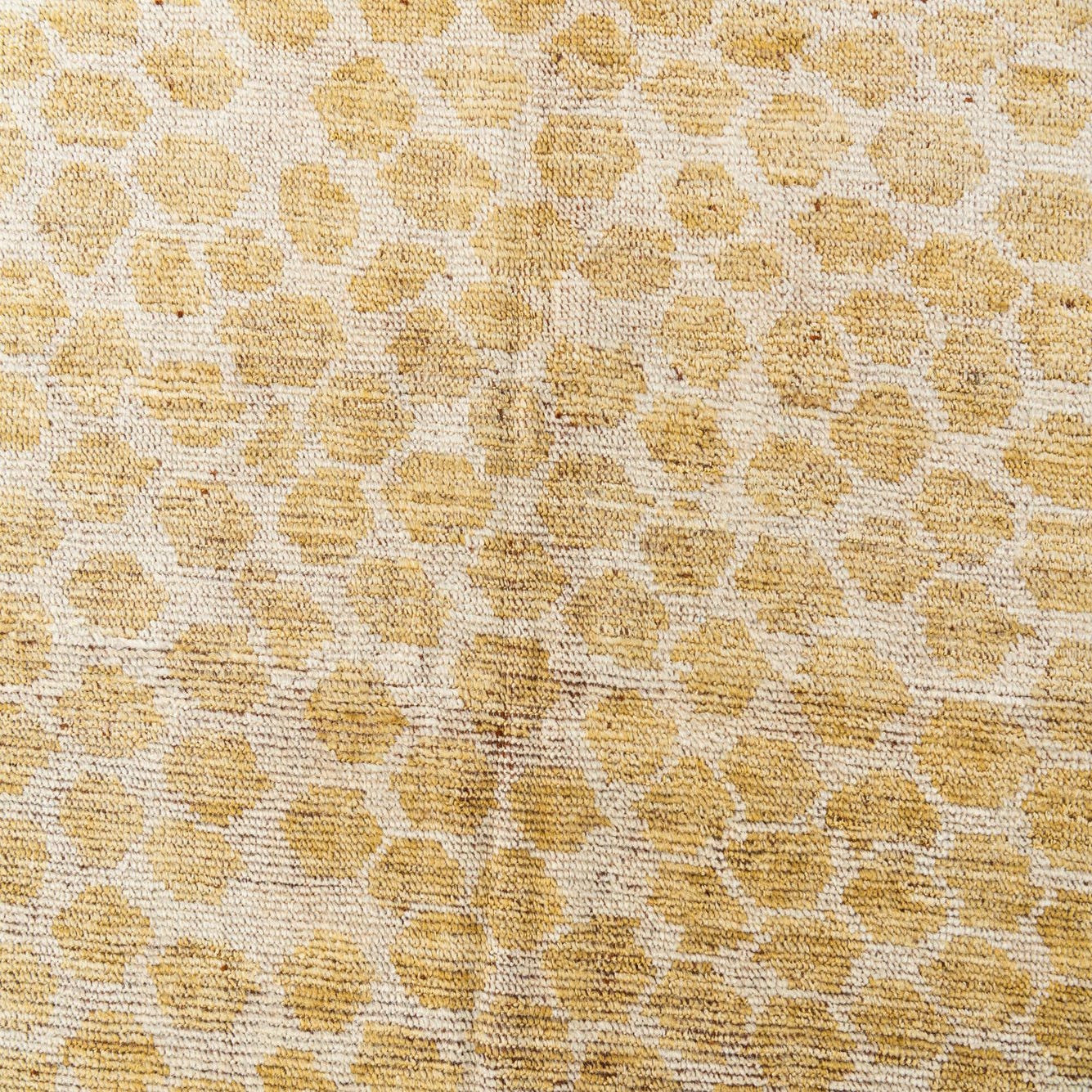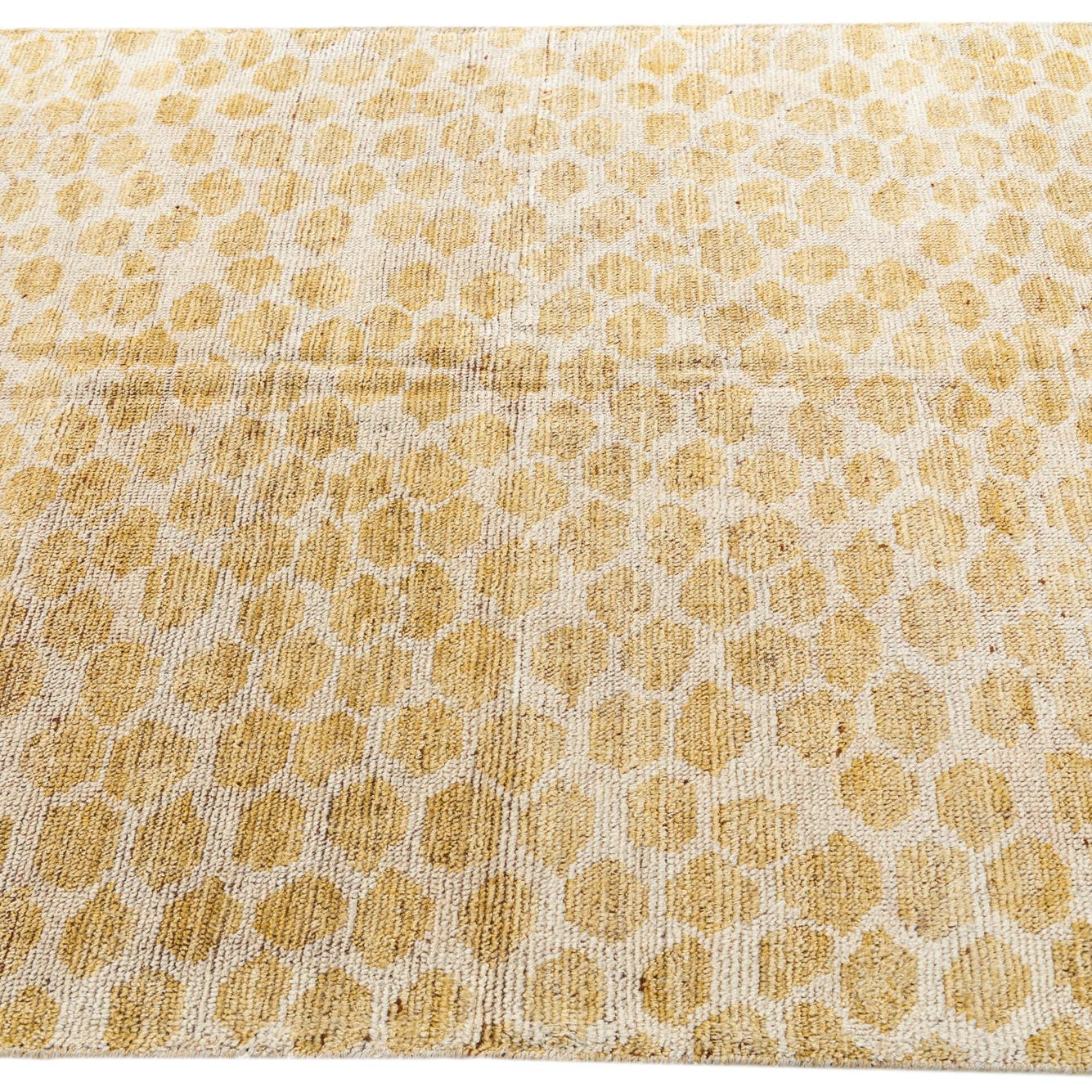 Hand-knotted from 100% wool, this rug features a warm yellow field punctuated by irregular ivory ovals that form an organic, pebble-like pattern. The surface has a low-profile, soft pile that feels warm and slightly springy underfoot, while the hand-knotted construction creates subtle variations in texture and color across the weave. The overall effect is a relaxed, modern pattern with a tactile presence you can both see and feel.