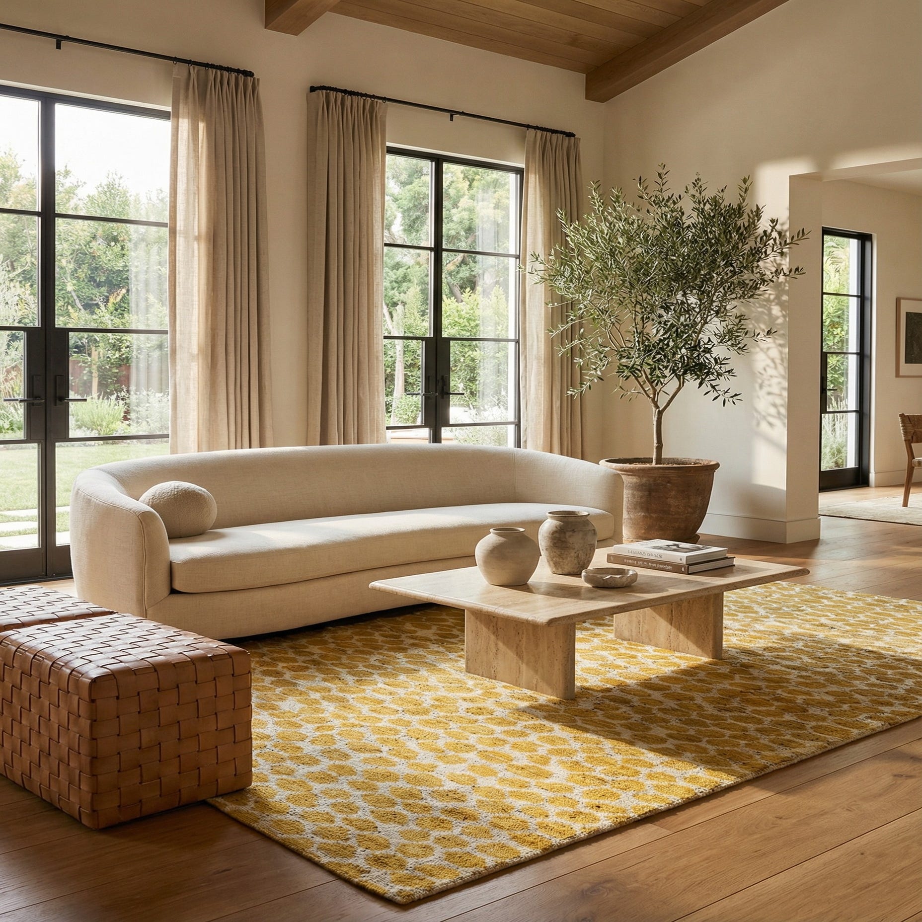 Primary color is Yellow. Colors in this rug include: Yellow, Ivory.