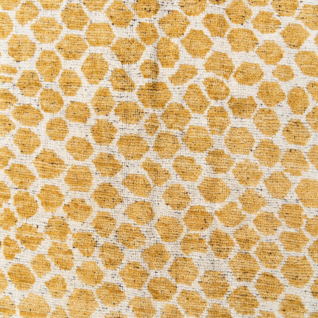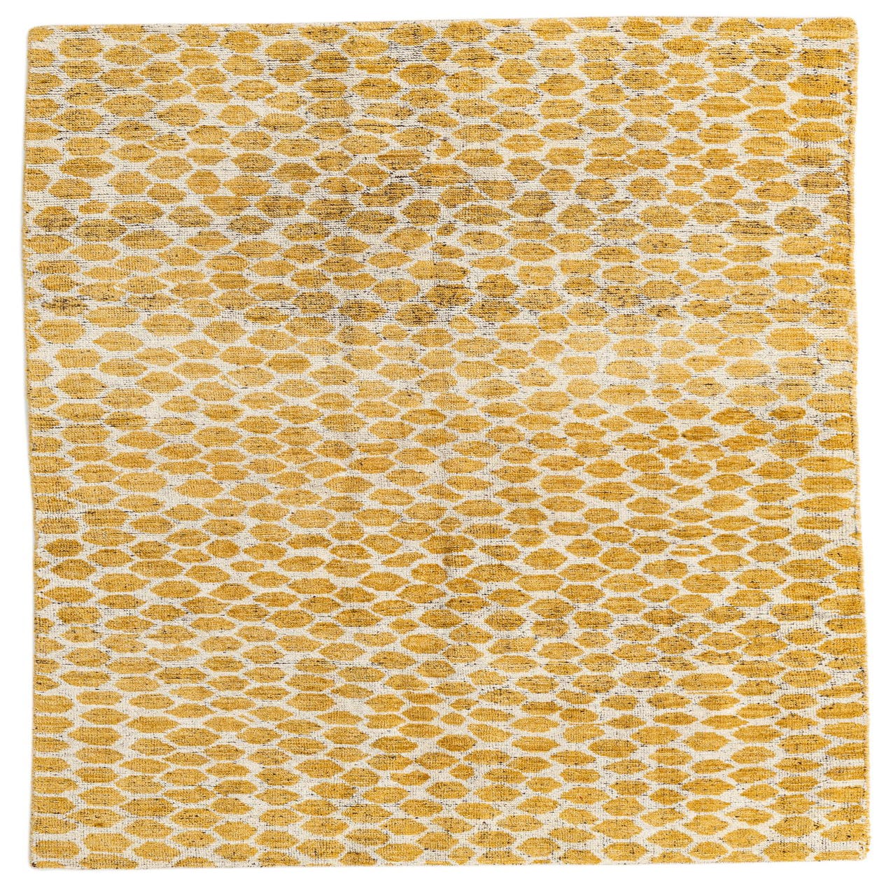 A 5x8 rectangular yellow and white tribal shag rug with an abstract honeycomb pattern, ideal for a living room.