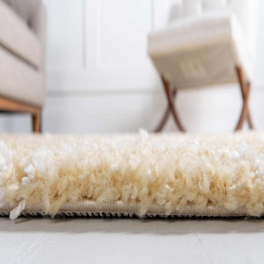 A warm yellow field anchors a soft, high-pile shag with an ivory diamond trellis woven into the surface. The irregular, elongated diamonds create a relaxed geometric pattern that reads handcrafted, while the dense, plush pile invites you to run your hand across it and feel the bouncy, cushiony texture. Machine-made from 100% polypropylene, the construction gives the rug a uniform finish and a forgiving, easy-to-place silhouette.