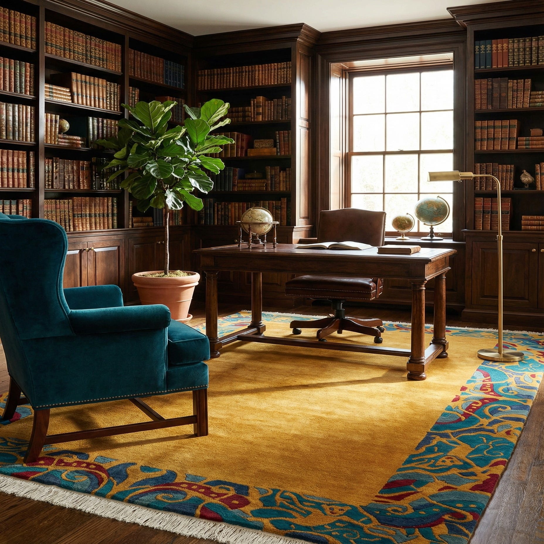 Primary color is Yellow. Colors in this rug include: Yellow, Blue, Navy Blue, Red, Green.