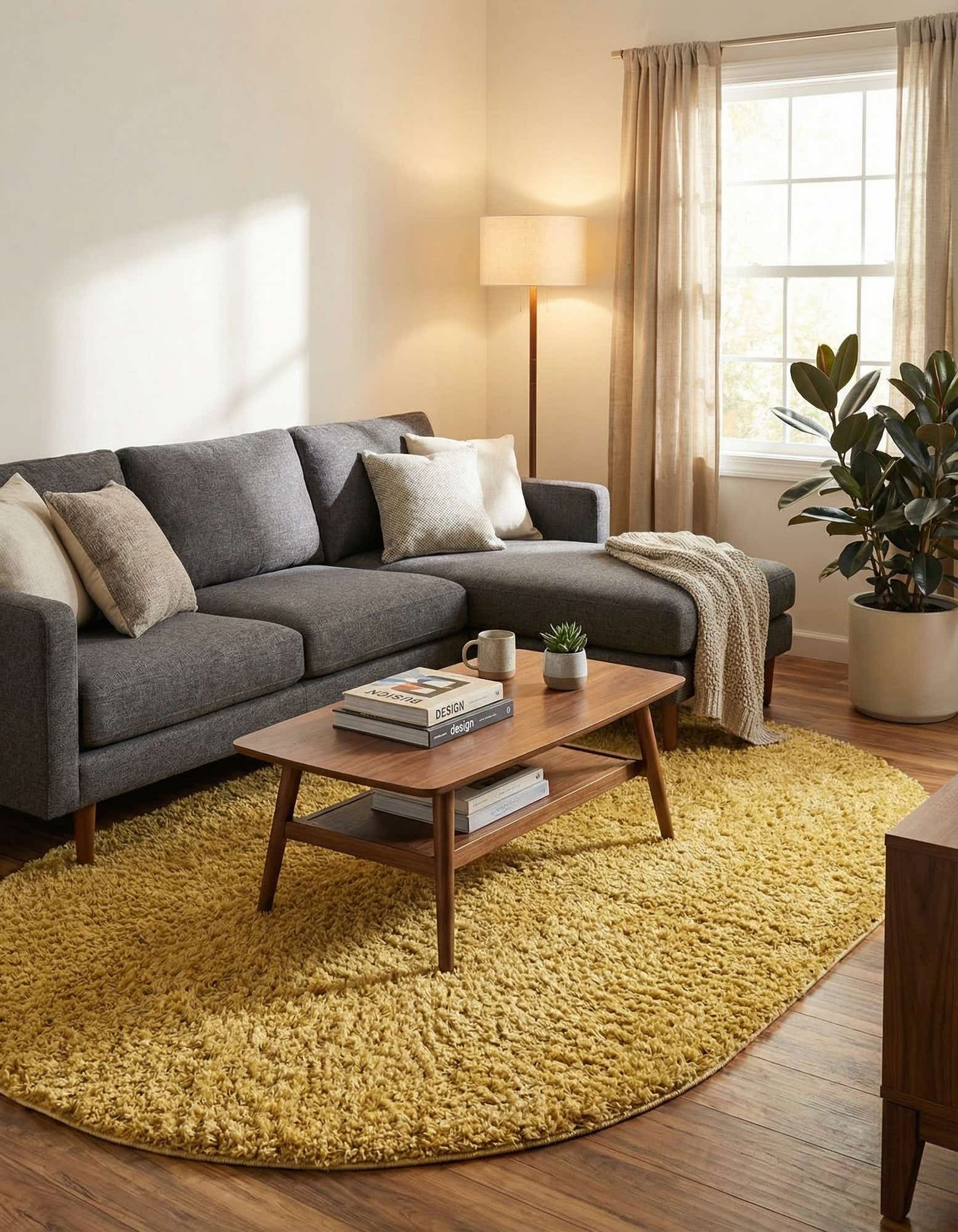 A plush, high-pile shag in a warm yellow field, this oval rug brings color and texture without a busy pattern. The dense polypropylene fibers form a thick, cushiony surface that you can feel underfoot; the pile reflects light subtly, giving the surface a gentle variation in tone and a tactile, inviting loop-and-cut appearance. Its clean, single-color design keeps the look simple while the shag construction adds depth and a relaxed, contemporary vibe.
