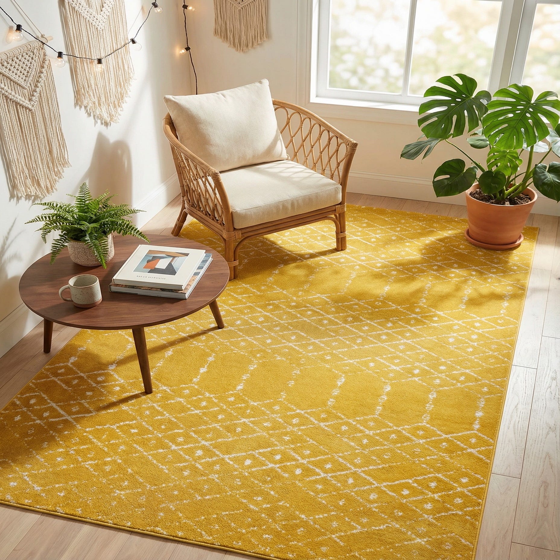 Machine made of 100% polypropylene, the rug has a low, soft pile that feels pleasant underfoot while keeping the pattern crisp and well-defined. The warm yellow and ivory palette brightens a room without overpowering other finishes—place it beneath a neutral sofa to lift a living room, under a dining table to introduce color, or in a sunlit reading nook paired with natural woods, navy accents, or white-painted furnishings for a fresh, welcoming vibe.