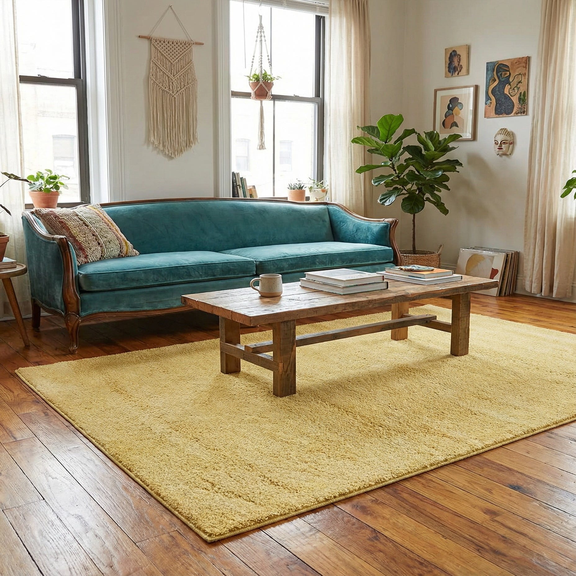 This yellow rug works well where you want a warm, uplifting anchor: place it beneath a neutral sofa to brighten a living room, layer it in a sunlit reading nook, or add it to a bedroom for a burst of color underfoot. It pairs nicely with warm wood tones, soft grays or creams, and natural woven accents, and can temper bolder prints when used alongside patterned cushions or curtains.