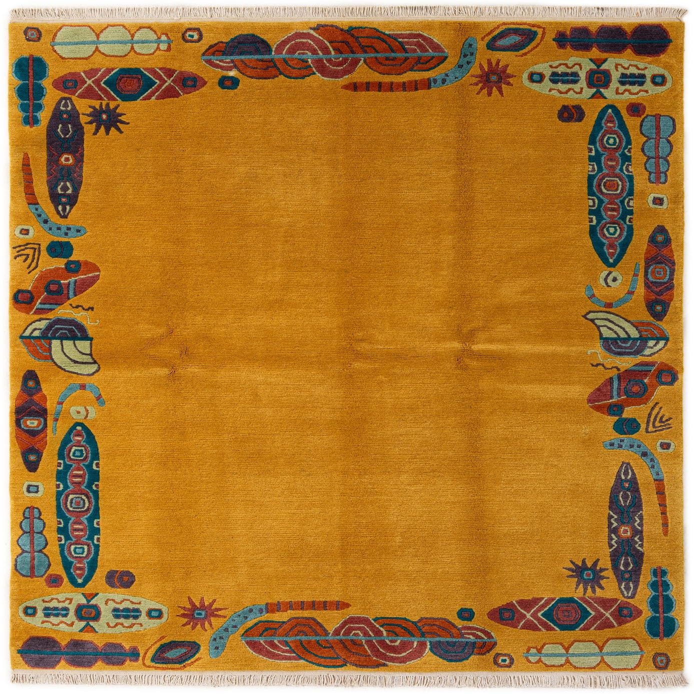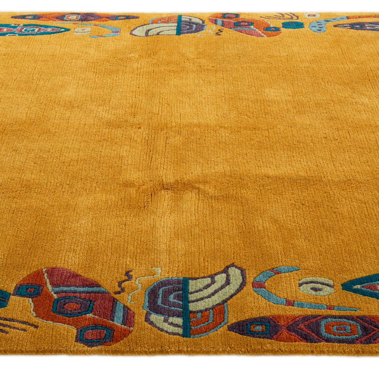 A 5x8 rectangular yellow wool rug with a colorful abstract border featuring teal, red, and orange shapes.