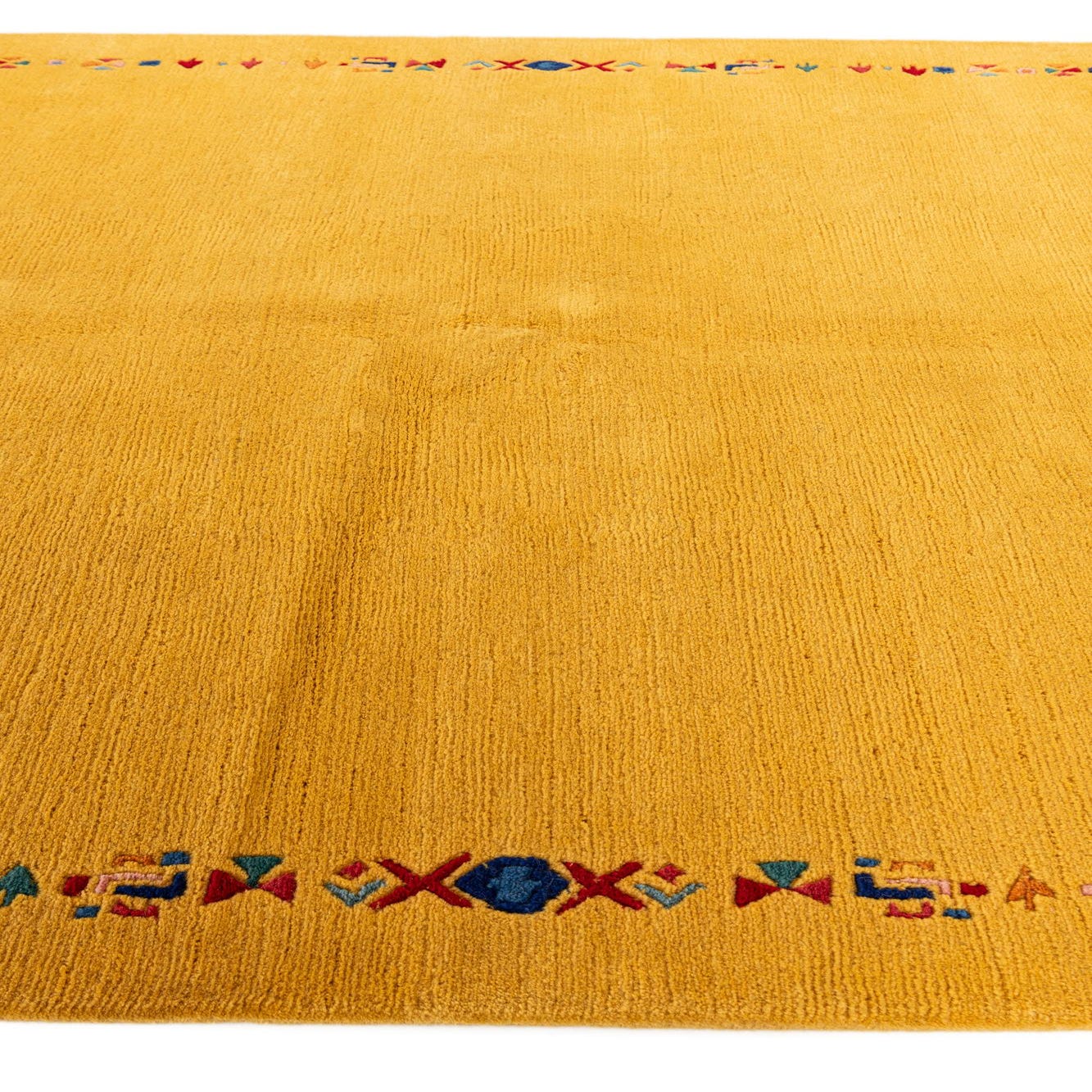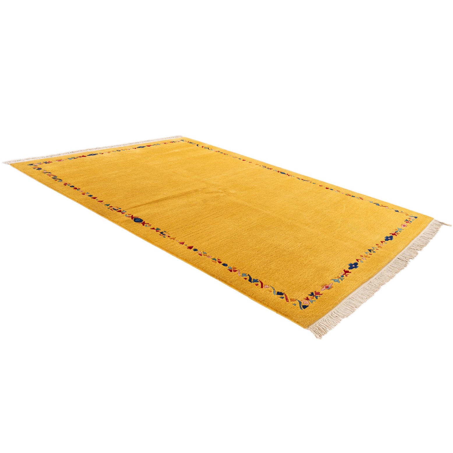 A 5x8 rectangular yellow wool rug with a colorful modern oriental border pattern and fringe.
