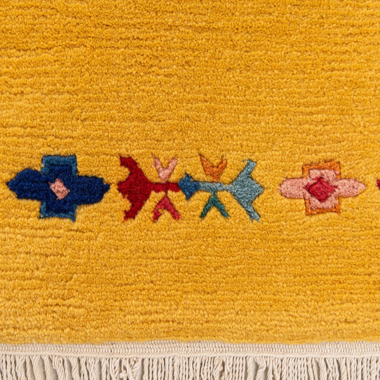 Primary color is Yellow. Colors in this rug include: Yellow, Navy Blue, Red, Pink.
