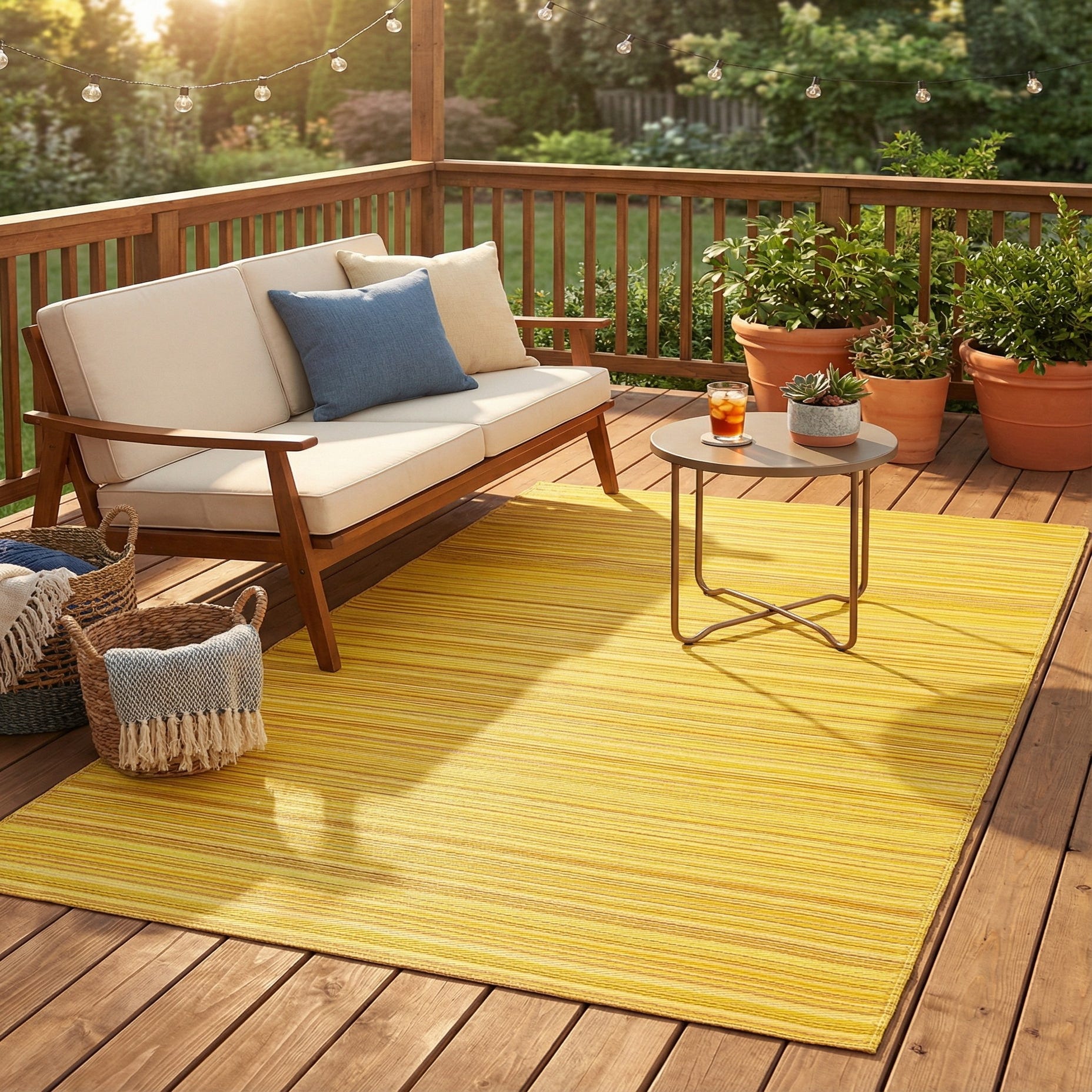Ideal for an open-air dining area, sunroom, or balcony seating group, this rug anchors furniture while maintaining an easy, sunny vibe. Pair it with natural wood or teak pieces and navy or white accents for a modern coastal feel, or use it to liven up a neutral patio set and potted greenery. It also fits well in contemporary indoor spaces that benefit from a pop of color and a structured, linear pattern.