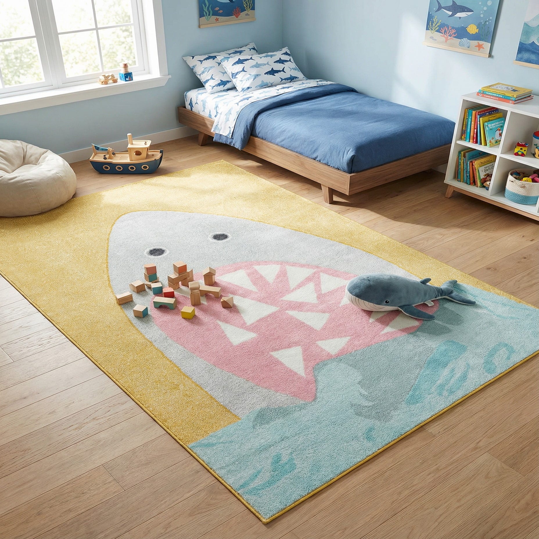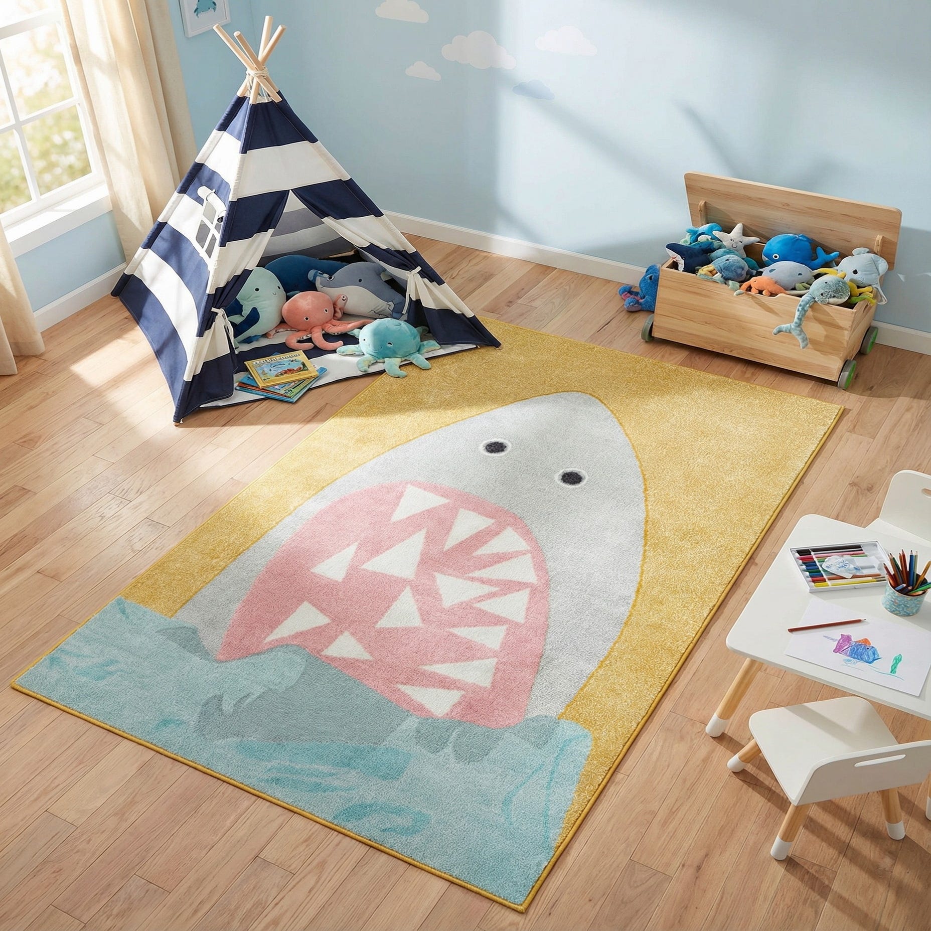 This Whimsy Kids collection rug is a playful addition to any child's room or play area, featuring a charming and friendly shark motif. A cheerful yellow background sets the stage for the shark design in soft gray with details in ivory, pink, and light blue, creating an inviting and imaginative space for little ones. Made of 100% polypropylene, this 5x8 rug is both stain-resistant and shed-free, ensuring it is durable enough to withstand the rigors of everyday play.