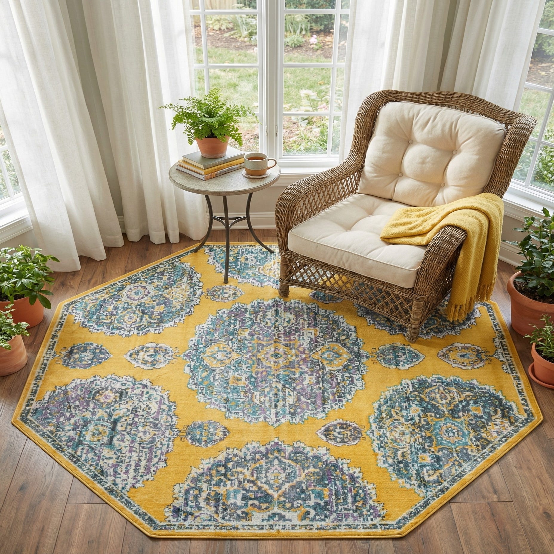 Octagon yellow area rug with a distressed bohemian floral pattern in shades of blue, purple, and grey.