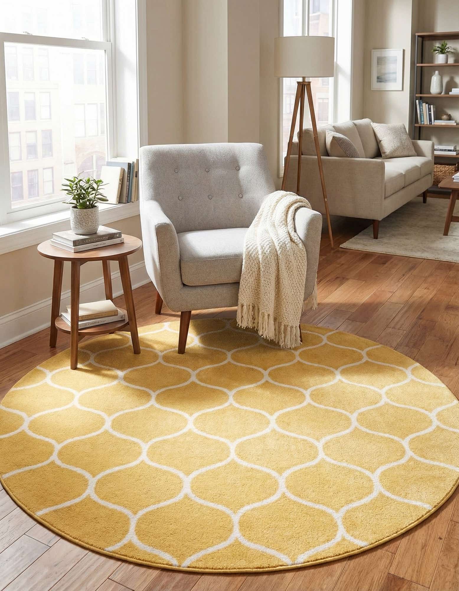 The round shape makes this piece ideal for anchoring a small dining area, brightening a breakfast nook, or adding a cheerful focal point in a nursery or entry. Pair it with natural wood furniture and soft grays for a Scandinavian approach, use it to add a warm pop of color in a modern living room, or layer it beneath mid-century seating to bring out warm wood tones. Ivory accents and navy or charcoal textiles create a pleasing contrast that keeps the palette grounded.