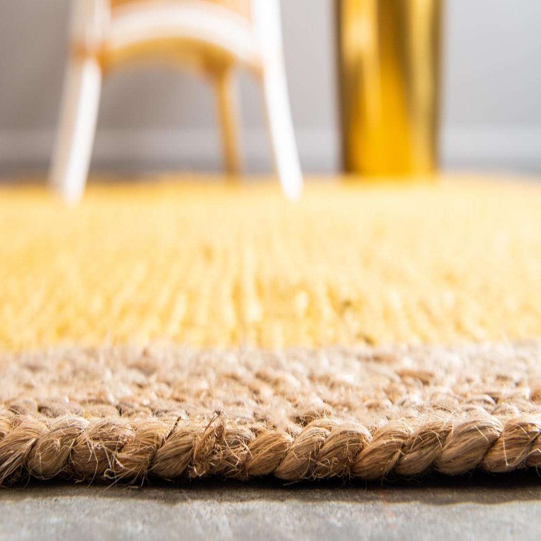 Hand-braided, 100% jute construction gives this runner a straightforward braided pattern with a sunlit yellow field and a natural-toned braided border that frames the center. The yellow shows subtle tonal variation across the braids, while the natural edge provides soft contrast and definition. The surface has a tactile, slightly coarse hand typical of jute—textured to the touch and visually warm.