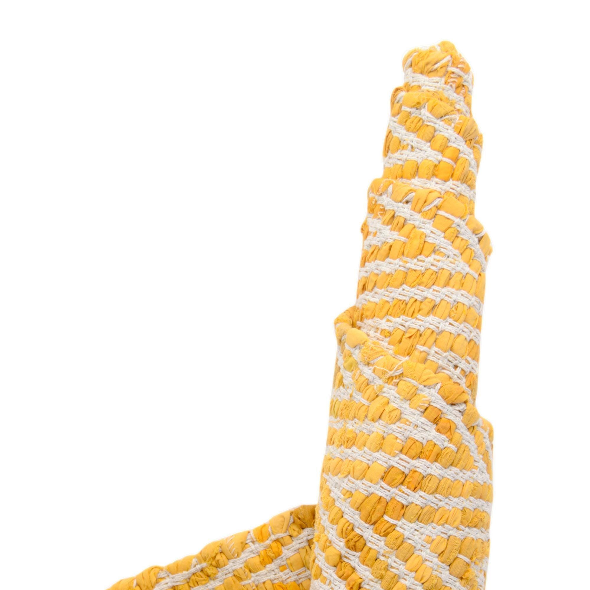 Hand-woven of 100% cotton, this chevron runner pairs a sunny yellow background with crisp ivory zigzag stripes for a fresh, graphic look. The repeating chevron pattern creates a steady, directional rhythm along the length of the piece, while the woven cotton construction gives a tactile surface with subtle ridging and a soft, low-profile feel underfoot. The yellow ground reads warm without overpowering, and the ivory accents keep the pattern clean and bright.