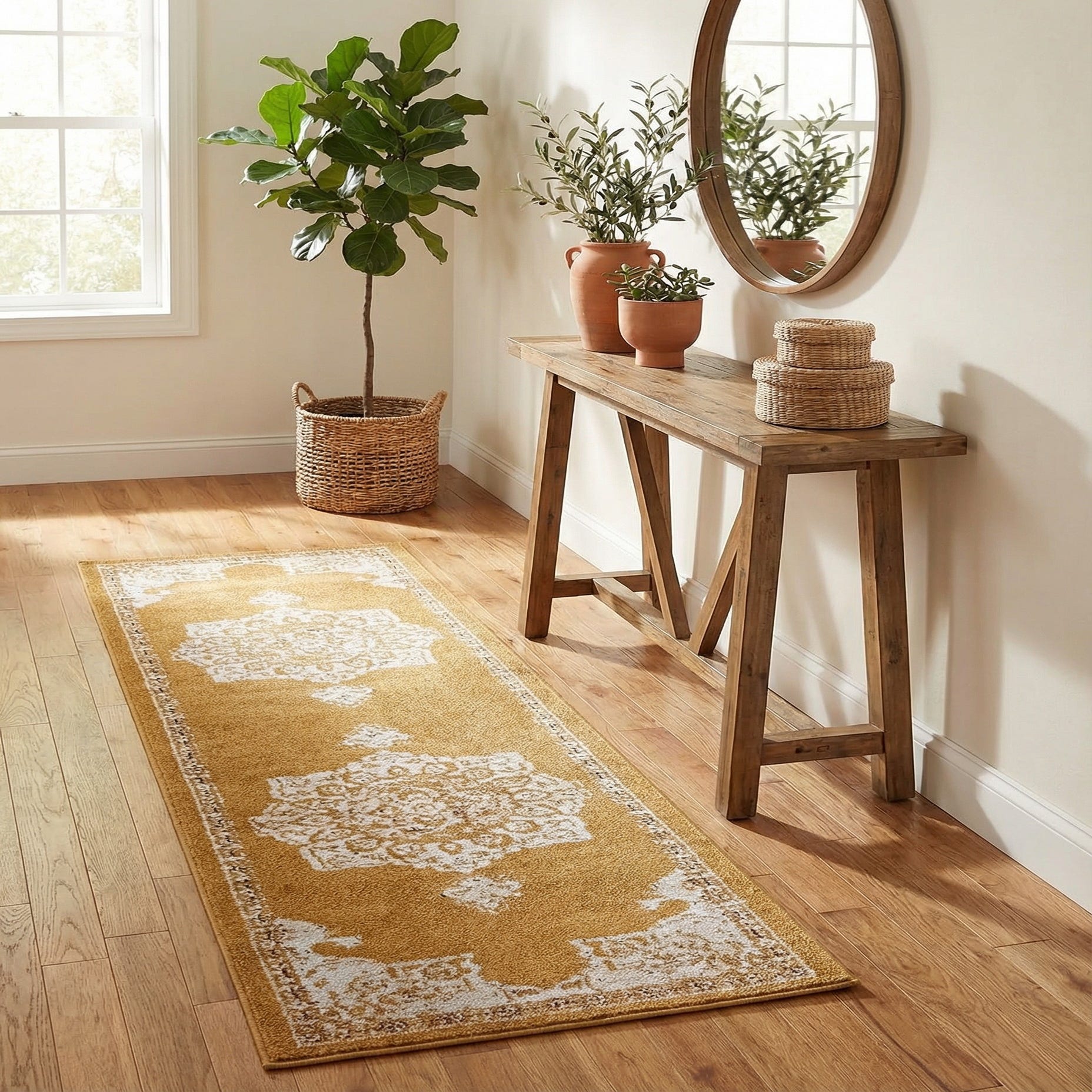This runner pairs well with warm wood floors, brass or antique-finish metals, and neutral upholstery—ideal for hallways, entryways, or flanking a bed. Its traditional medallion pattern and muted vintage character work well in transitional, modern farmhouse, or eclectic spaces where a touch of warmth and pattern is needed without overwhelming the room.