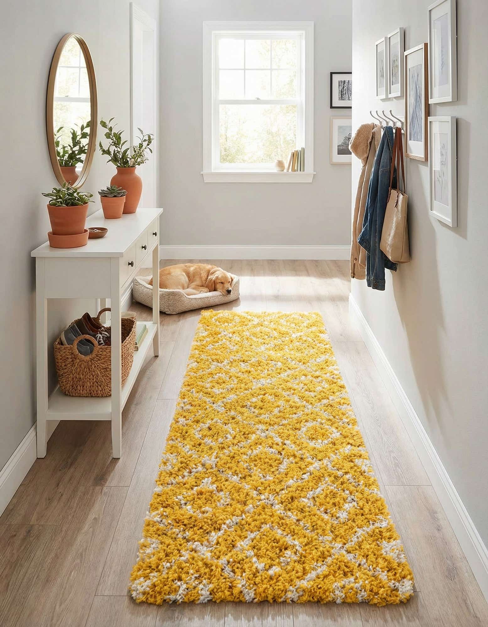 A 6 ft yellow and white runner rug with a modern geometric lattice pattern and high-low shag pile.