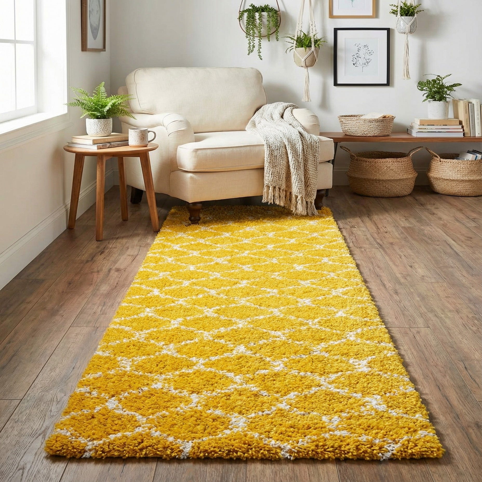 A 6 ft yellow runner rug with a modern white trellis pattern and textured high/low pile, ideal for a hallway.
