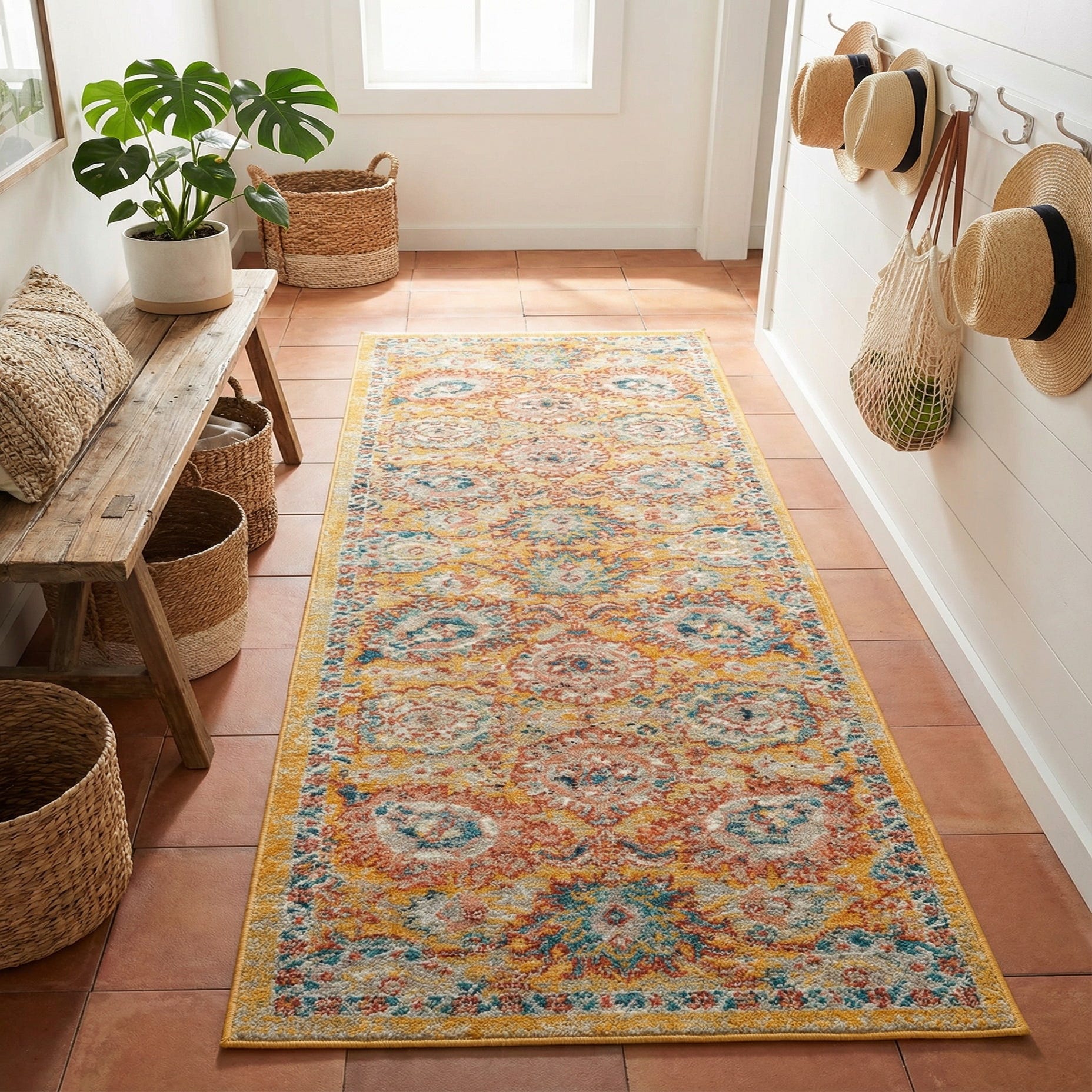 This runner works well in narrow, high-traffic spaces—hallways, entryways, and kitchen corridors—where its color can brighten the path. It also pairs nicely with natural wood tones and ivory walls for a modern farmhouse aesthetic, supports eclectic or bohemian schemes with layered textiles and rattan, and can act as a colorful accent in mid-century inspired rooms when coordinated with teal or rust accessories.