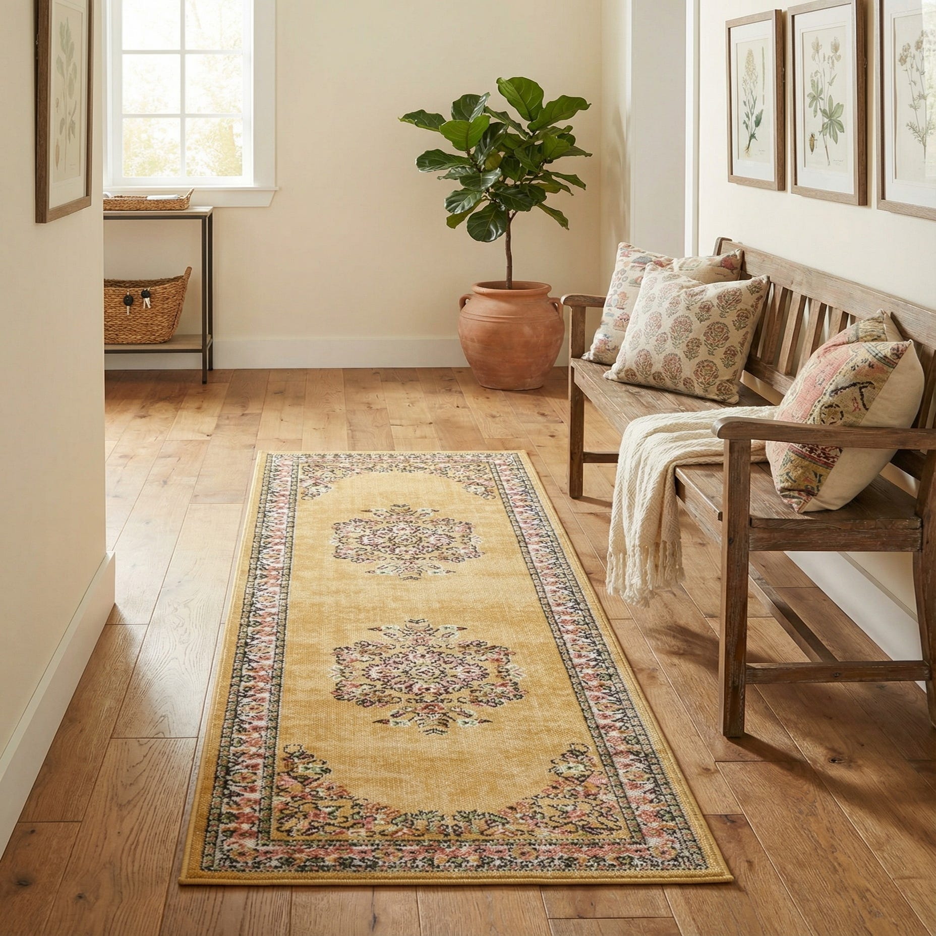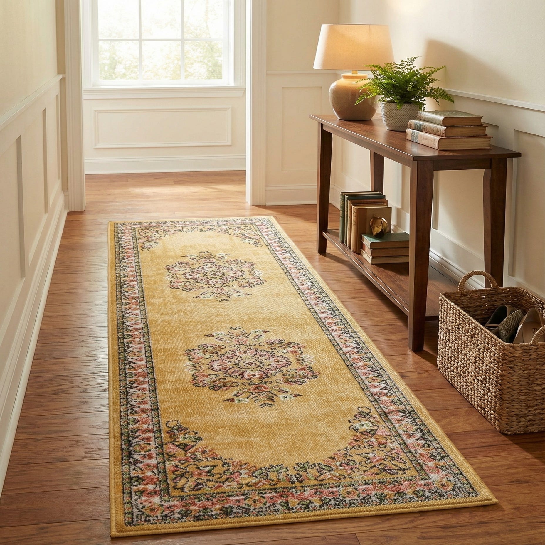 A warm yellow field sets the stage for a traditional medallion-and-floral design rendered in complementary tones of gold, red, light green, ivory and black. Two ornate medallions run along the center with delicate floral corner spandrels and a narrow floral border framing the piece. The pattern has a time-honored, Persian-inspired look with fine, tightly drawn motifs that create a balanced, classic feel across the runner.