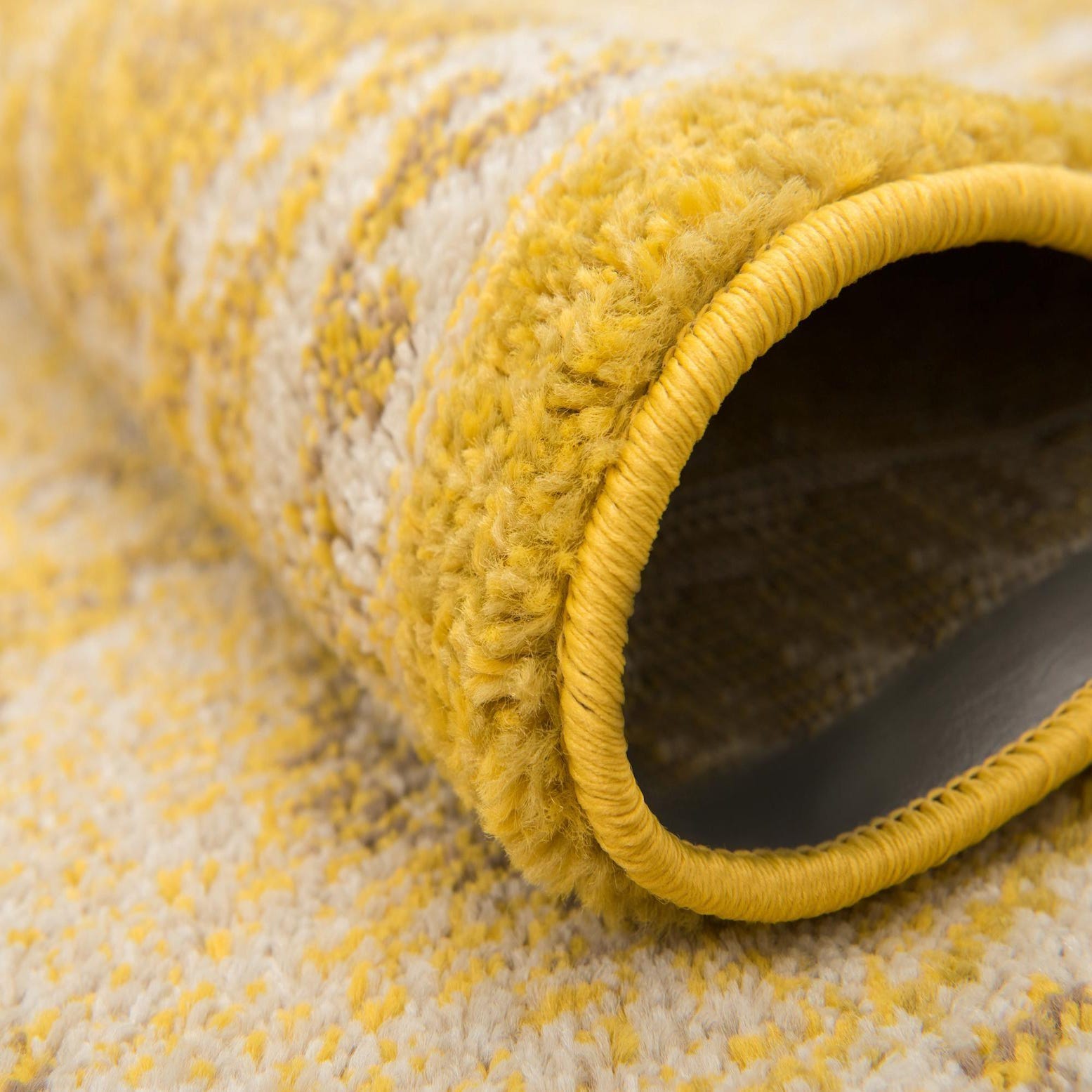 The pile has a textured, slightly dense feel underfoot—soft enough for daily paths yet substantial enough to define a narrow space. Place it in a hallway, entryway, kitchen aisle, or alongside a bed to introduce color and pattern without overwhelming the room. It complements natural wood floors and neutral furnishings, and works well with modern farmhouse, mid-century accents, or layered bohemian interiors where a warm pop of yellow and gentle patterning will tie the scheme together.