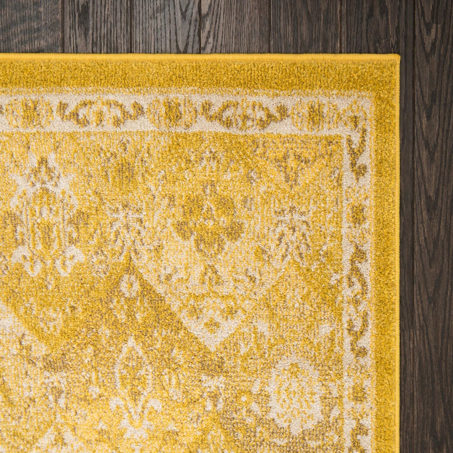 Machine made from 100% polypropylene, this runner pairs a traditional medallion-and-border motif with a softly distressed finish. Ivory and beige motifs are layered over a warm yellow background, creating depth and a subtle two-tone effect that highlights the rug’s ornamental details without heavy contrast. The overall look leans transitional, blending classic patterning with a contemporary color palette.